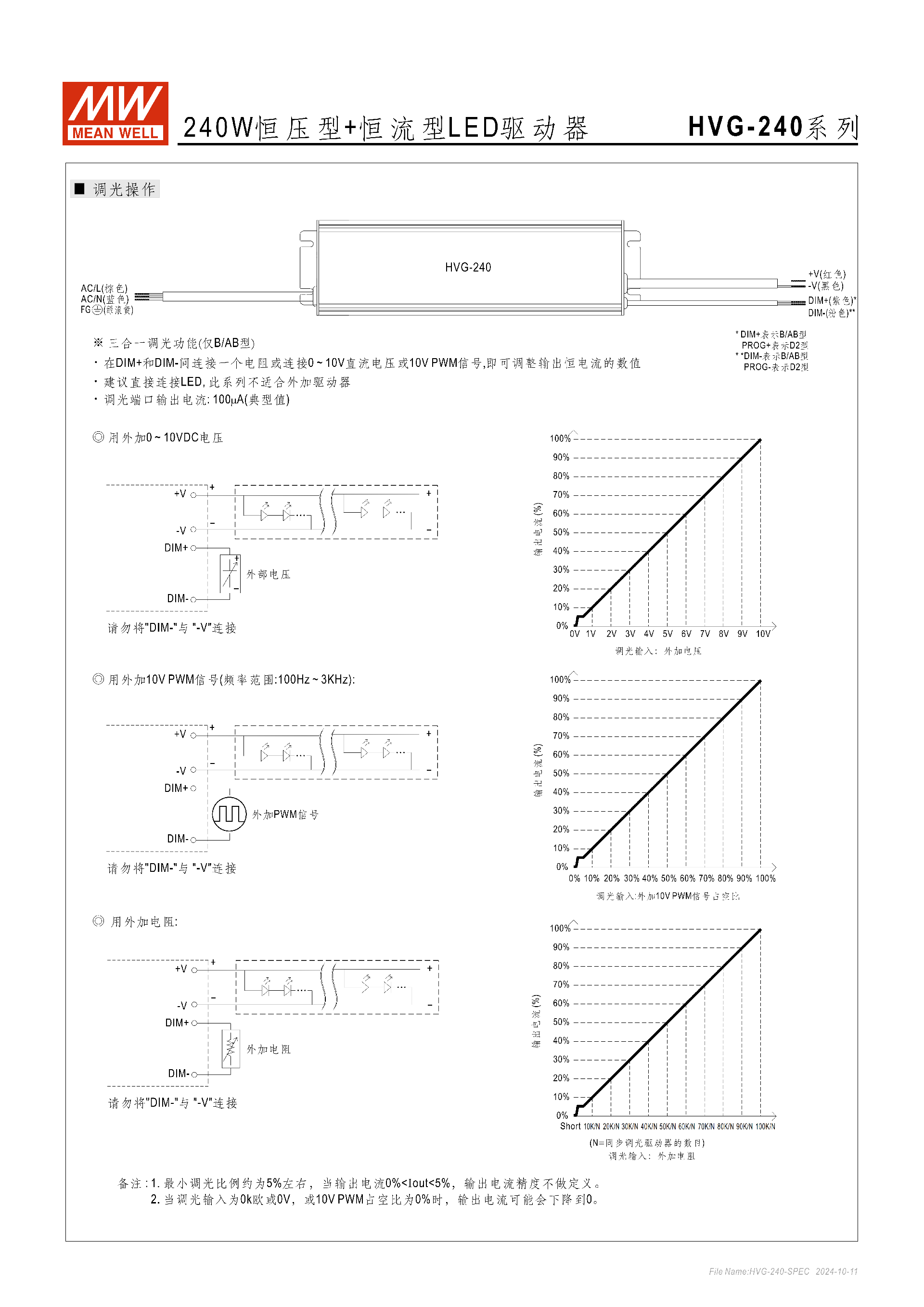 注意事項:最小調(diào)光比例約5%,此區(qū)間電流精度無定義;0V/0 歐 / 0% 占空比時輸出電流可降至 0;禁止 DIM - 與 - V 連接