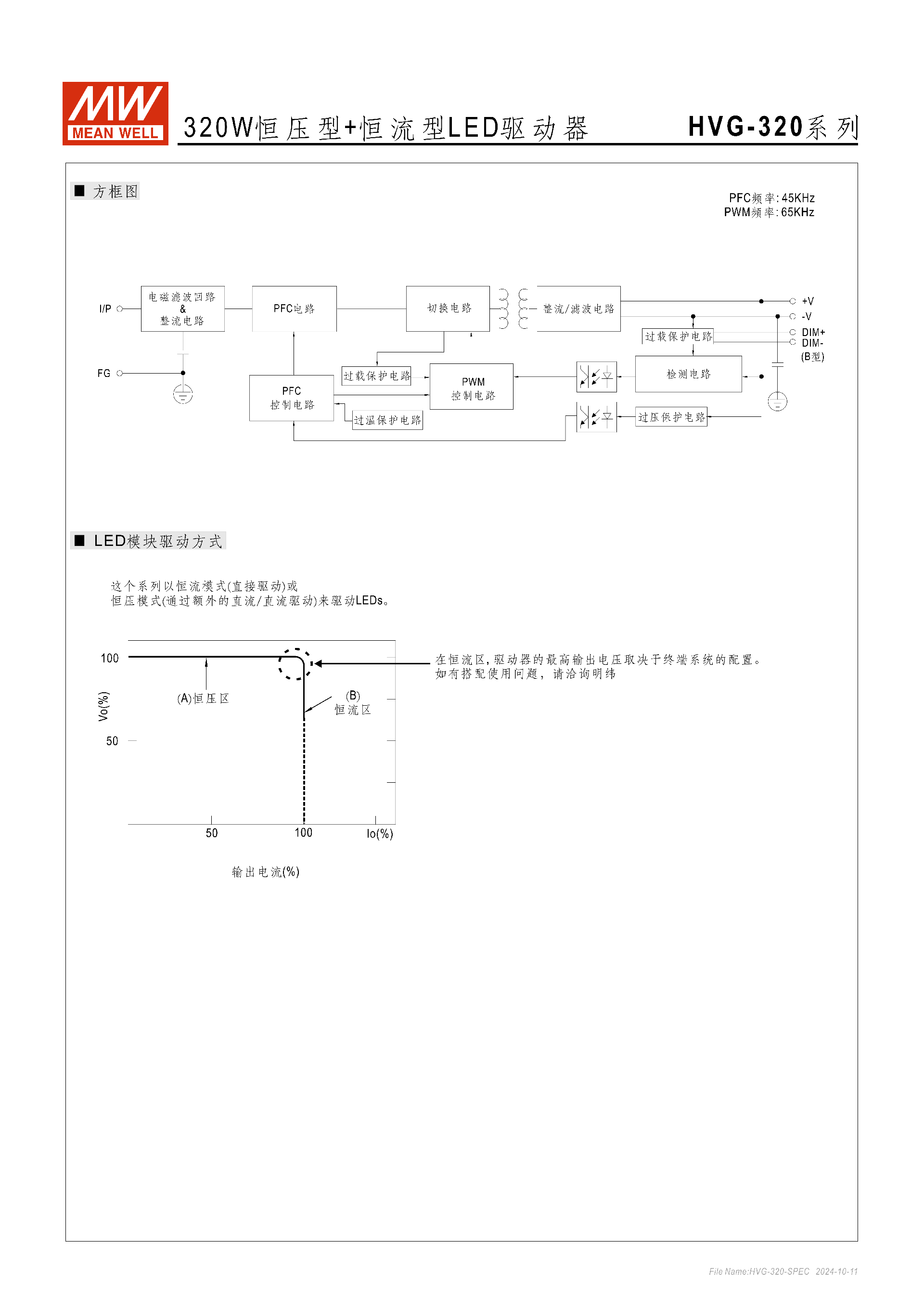 明緯HVG-320 系列是 320W 恒壓恒流雙模式 LED 驅動器,具備180~528VAC寬輸入電壓范圍,輸出額定電壓涵蓋24V~54V多機型,擁有IP65/IP67防護等級、Class Ⅰ金屬外殼及內置主動式 PFC 功能,轉換效率最高達94%,無風扇設計可在 **-40℃~+85℃機殼溫度工作,壽命超50000 小時且提供5 年 ** 保固;該系列分 A/B/AB/Dx/D2 等功能型號,支持內部電位器調節(jié)、三合一調光(0~10Vdc/10V PWM / 電阻)、智能定時調光等功能,過流 / 短路 / 過壓 / 過溫全保護,適用于 LED 街道、高架、捕魚燈等戶內戶外照明場景,還可用于 Class Ⅰ Division 2 類危險地點。