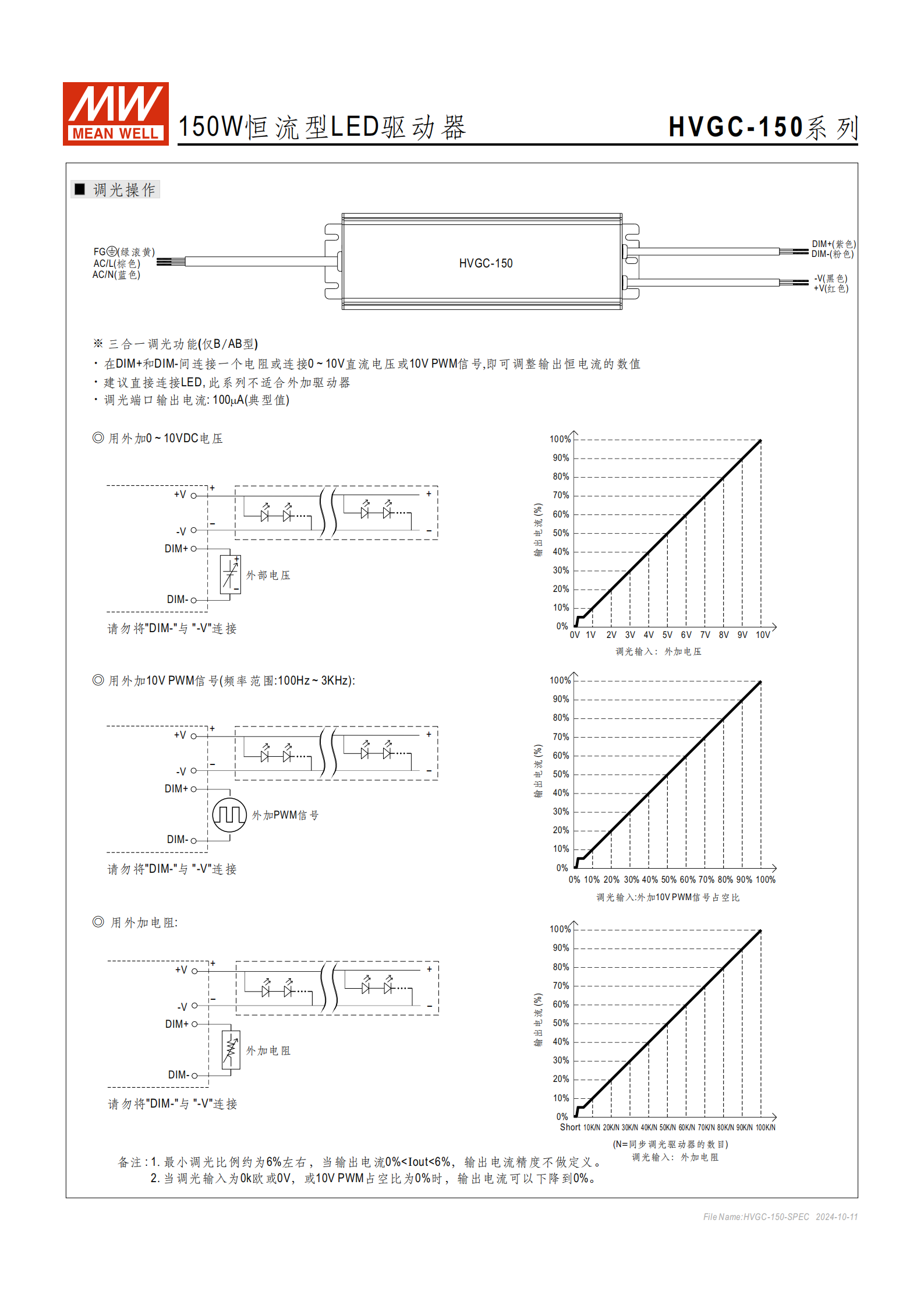 答案:三合一調(diào)光通過 DIM + 和 DIM - 端口實現(xiàn),三種操作方式為:①外接 0~10Vdc 直流電壓;②外接 10V PWM 信號(頻率范圍 100Hz~3KHz);③外接電阻。關(guān)鍵注意事項:①調(diào)光端口輸出電流典型值為 100μA,禁止將 DIM - 與 - V 端口連接;②最小調(diào)光比例約 6%,0%<Iout<6% 時電流精度無定義;③當(dāng)調(diào)光輸入為 0 歐 / 0V,或 10V PWM 占空比為 0% 時,輸出電流可降至 0%;④調(diào)光僅適用于 B/AB 型,A/D 型無此功能。