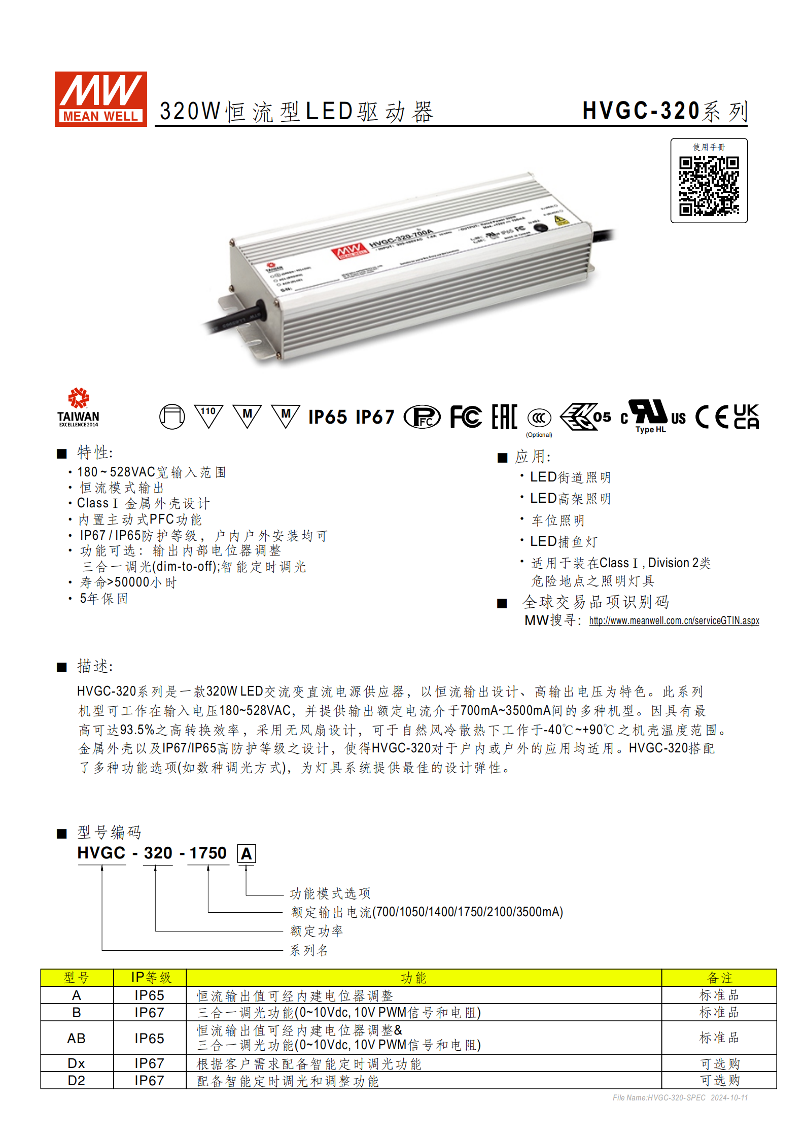 明緯HVGC-320 系列是 320W 恒流型 LED 驅(qū)動器,擁有180~528VAC寬輸入范圍,具備IP65/IP67防護等級、內(nèi)置主動式 PFC功能,轉(zhuǎn)換效率最高達93.5%,無風扇設(shè)計可在 **-40℃~+90℃機殼溫度下工作,提供 700mA~3500mA 多檔額定輸出電流,分 A/B/AB/Dx/D2 等功能型號,支持內(nèi)部電位器調(diào)流、三合一調(diào)光(0~10Vdc/10V PWM / 電阻)、智能定時調(diào)光等功能,適配 LED 街道 / 高架 / 車位 / 捕魚燈等照明場景,防護含短路、過壓、過溫保護,壽命超50000 小時 **,提供5 年保固。
