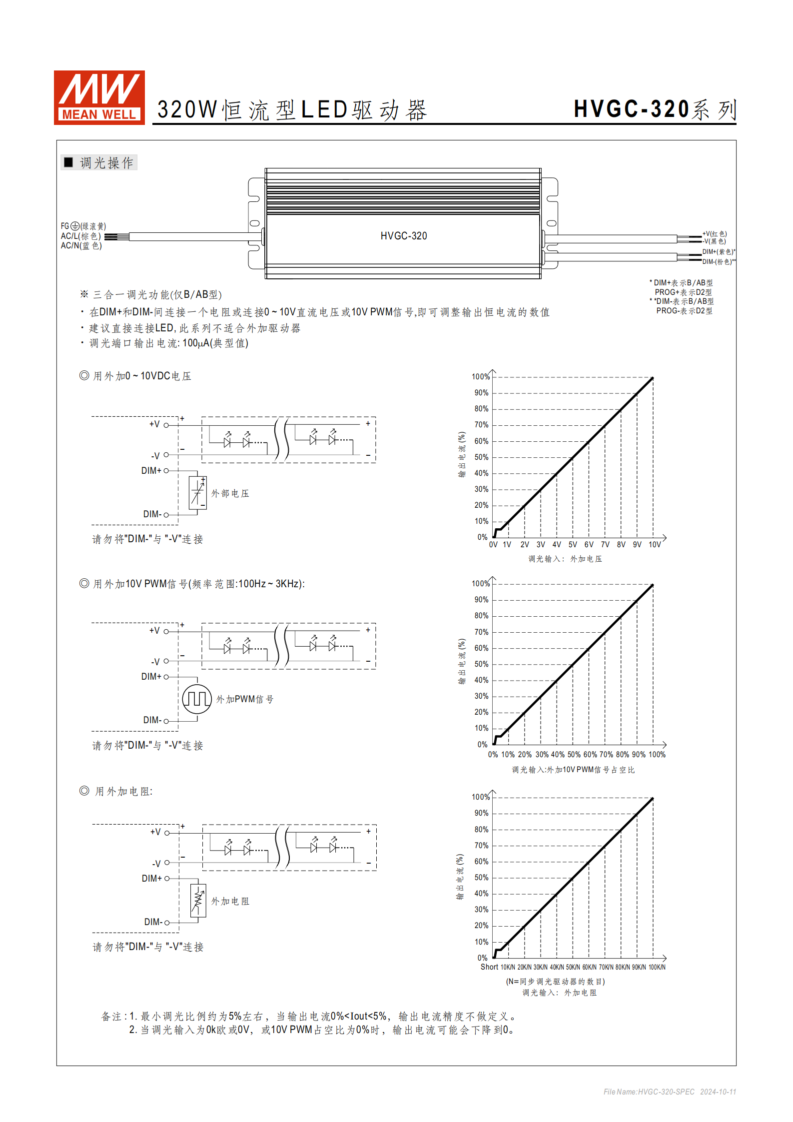 調(diào)光比例:最小約5%,0V/0 歐 / 0% 占空比時(shí)輸出電流可降至 0,5% 以下電流精度無定義;