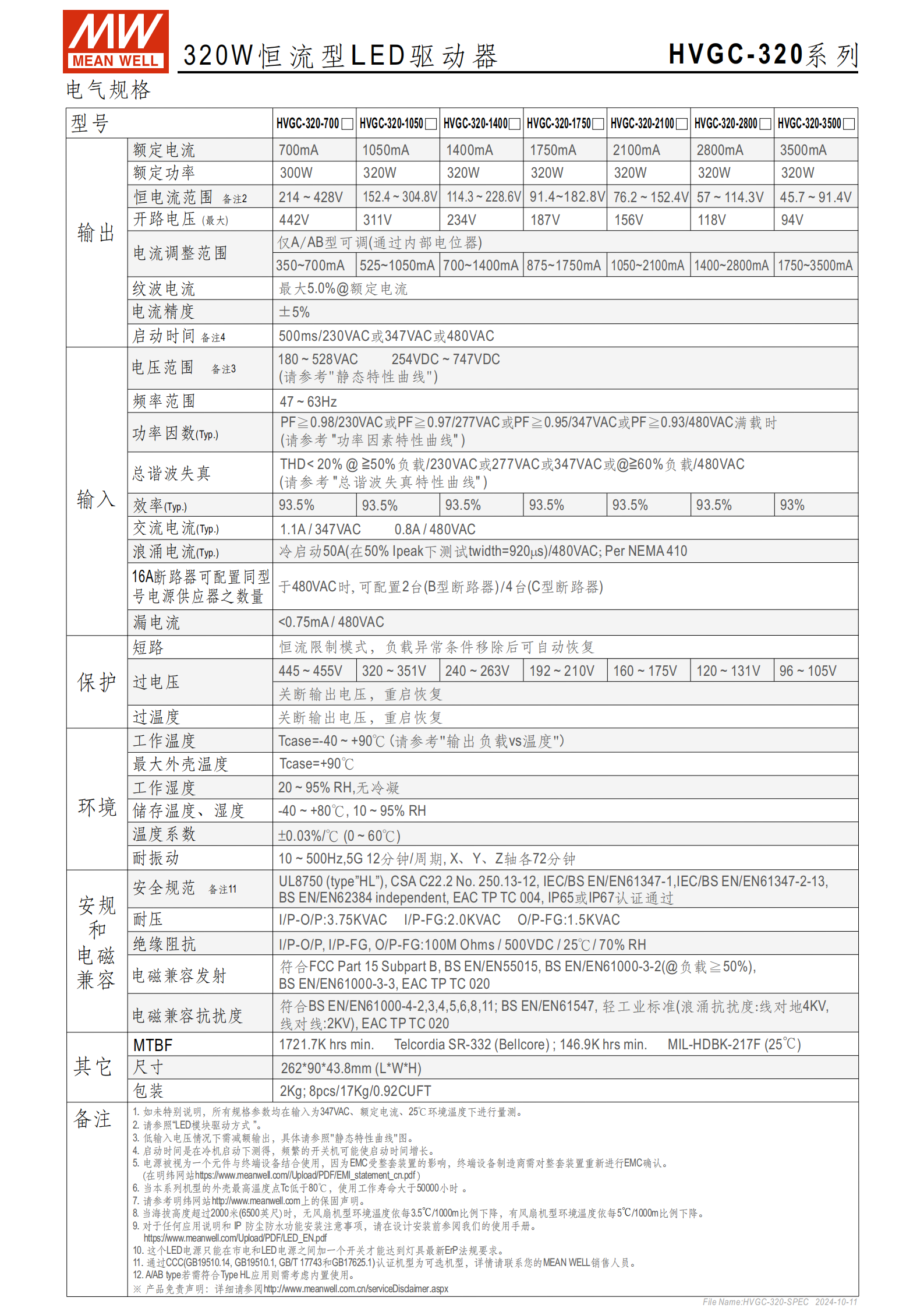 | HVGC-320-1750 | 1750mA | 91.4~182.8 | 187 | 875~1750mA | 192~210 |