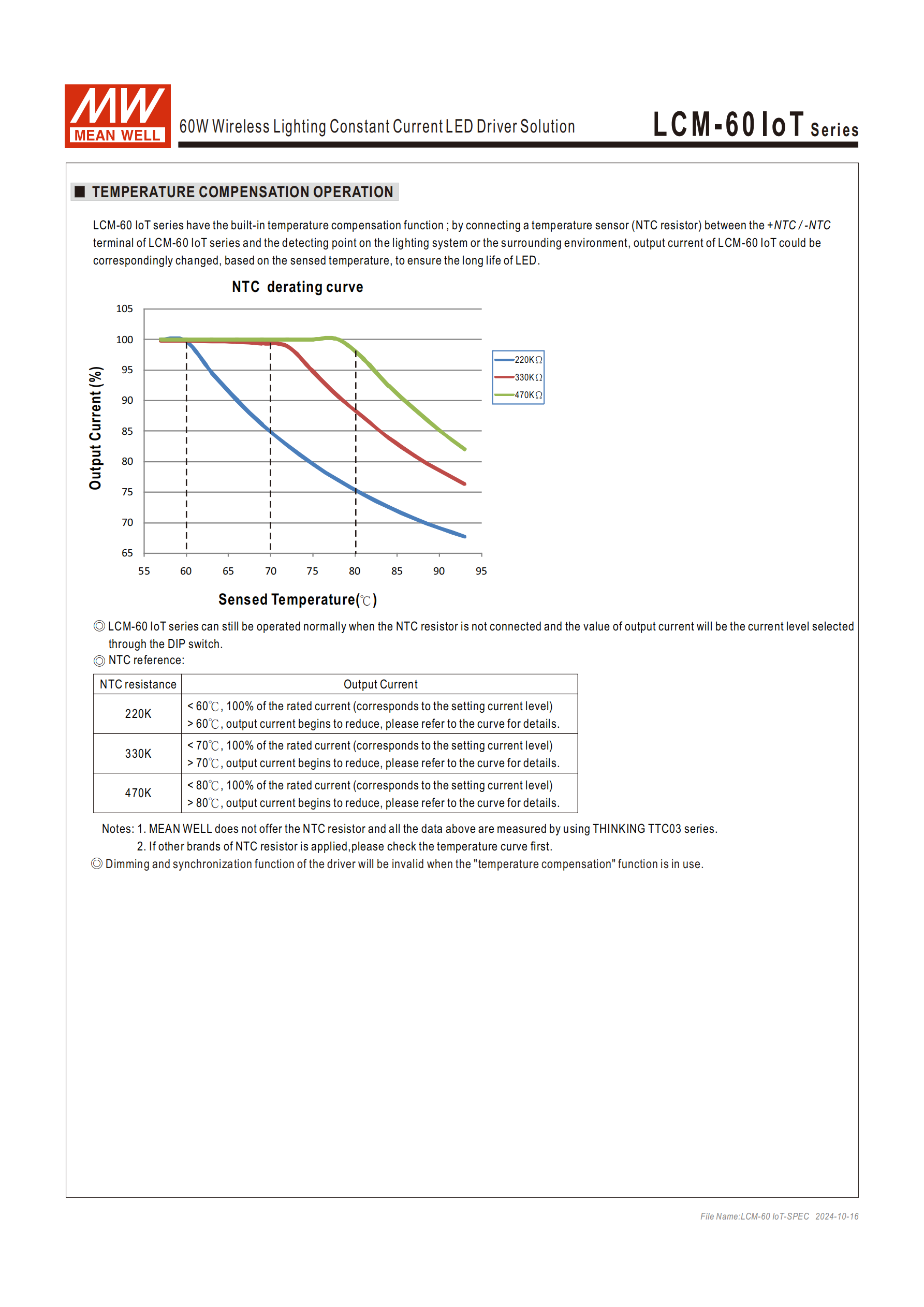 NTC 規(guī)格:支持 220K/330K/470KΩ 三種阻值,明緯不提供該電阻,推薦 THINKING TTC03 系列;