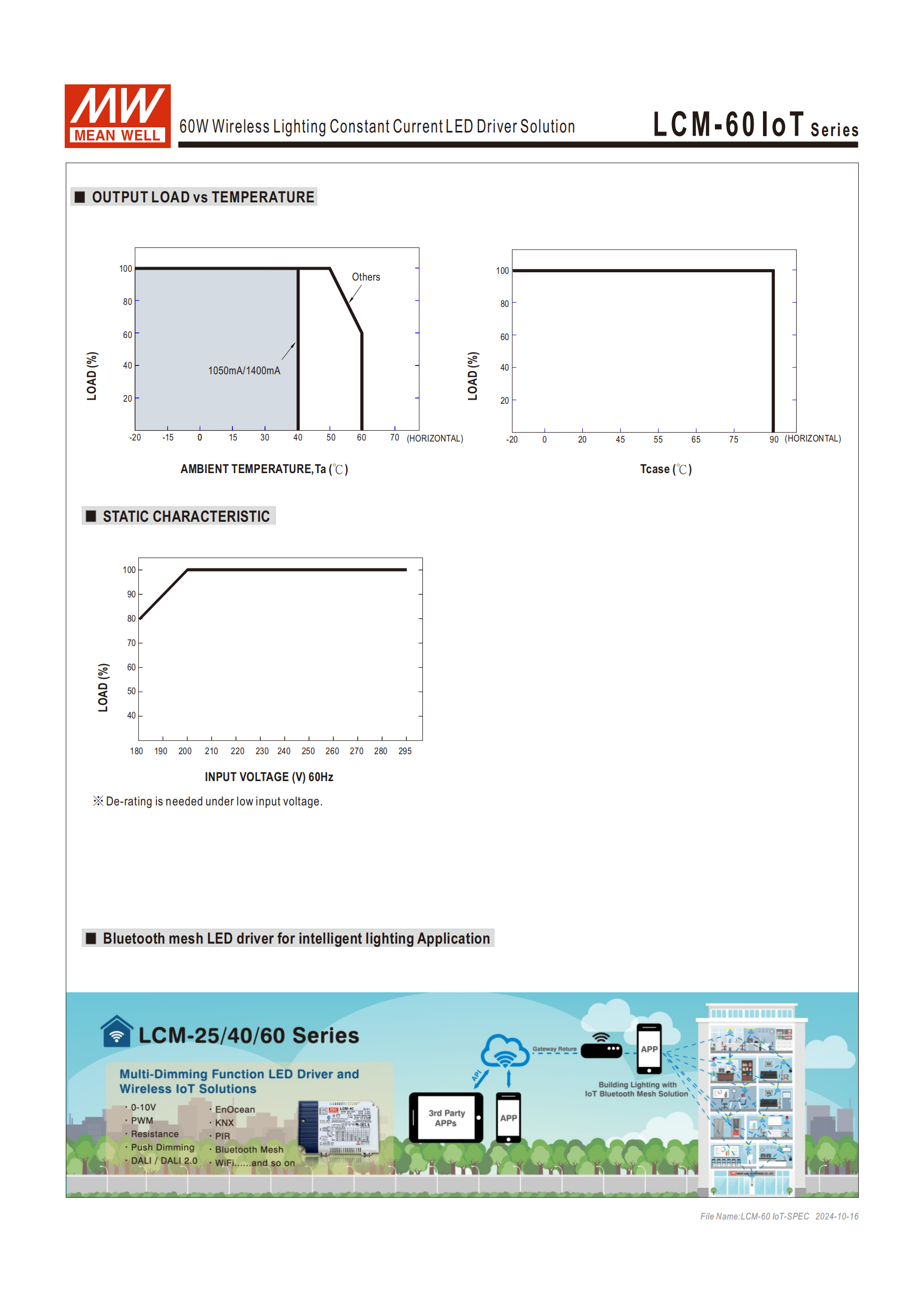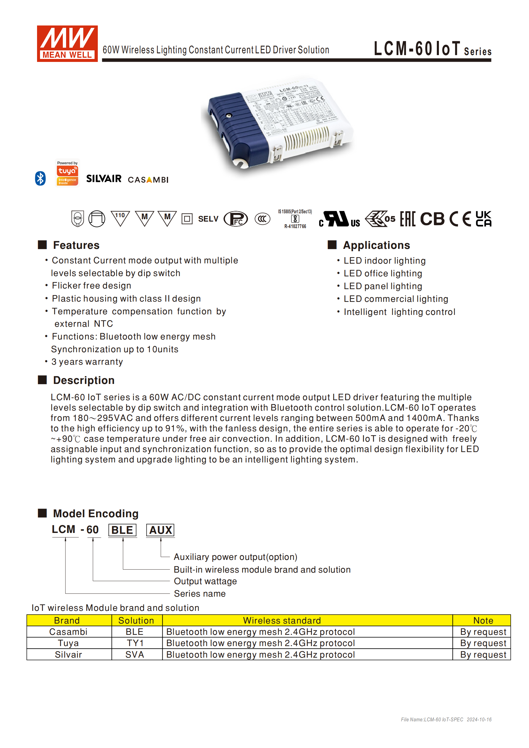 明緯LCM-60 IoT 系列是 60W 無線照明恒流型 LED 驅(qū)動器,支持180~295VAC輸入電壓,輸出電流可通過指撥開關(guān)在500mA~1400mA間六檔調(diào)節(jié),集成 Casambi、Tuya、Silvair 三款低能耗藍牙 2.4GHz 無線模塊(均為定制品),具備無頻閃、10 臺同步、外部 NTC 溫度補償等核心功能,調(diào)光范圍 0~100%(最低 6%),轉(zhuǎn)換效率最高91%,工作機殼溫度 **-20℃~+90℃**,擁有短路、過壓、過溫多重保護,安規(guī)與電磁兼容認(rèn)證齊全,適配 LED 室內(nèi)、辦公、板燈、廣告牌等智能照明場景,提供 3 年保固。