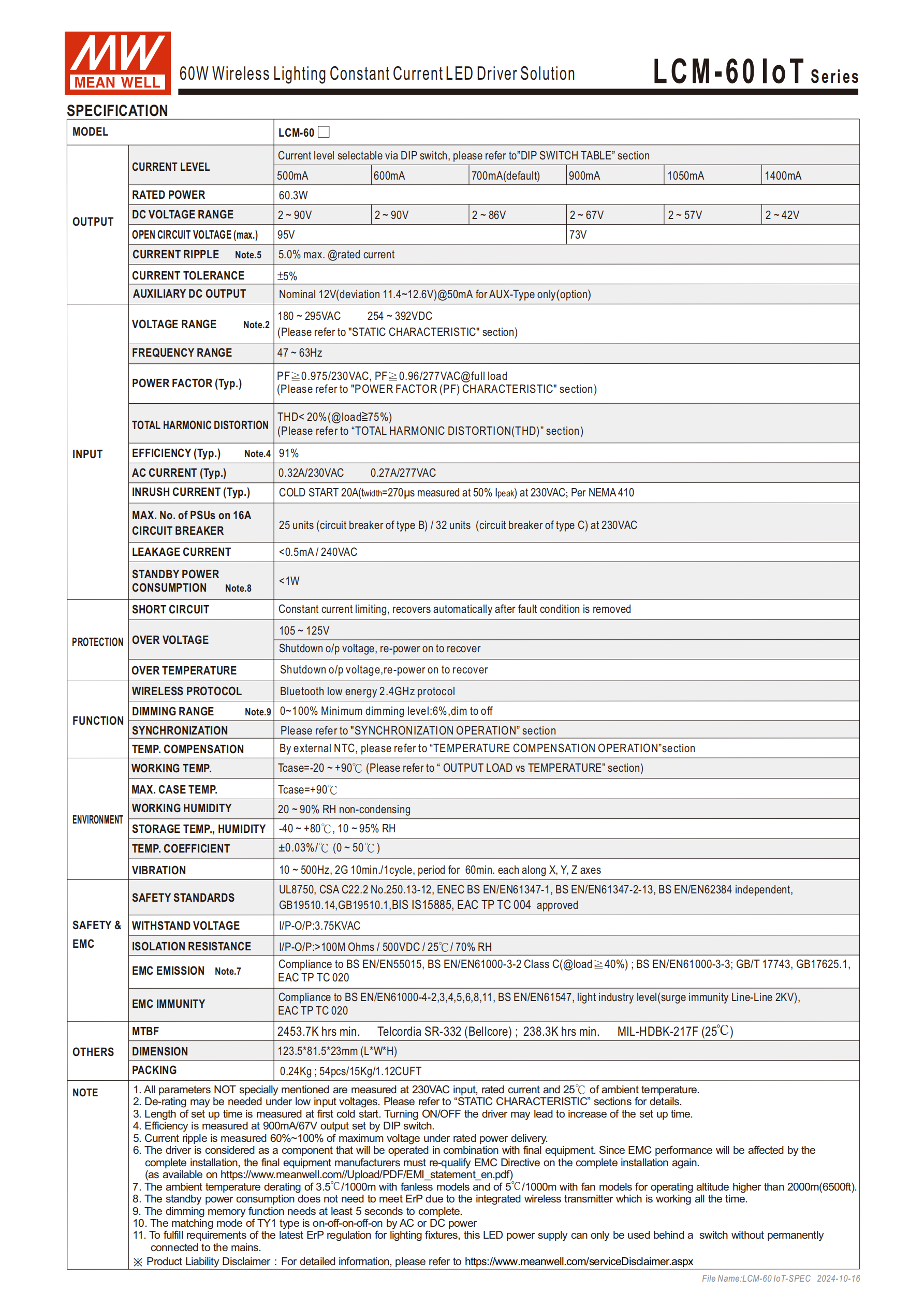 明緯LCM-60 IoT 系列為60W 交流變直流恒流型 LED 驅(qū)動器,主打無線智能控制,適配 LED 智能照明全場景,采用塑膠外殼 Class Ⅱ 設(shè)計,無風(fēng)扇自然風(fēng)冷,提供3 年保固,為全球交易品項,整機凈重 0.24Kg,包裝規(guī)格 54pcs/15Kg/1.12CUFT,尺寸為123.581.523mm(LWH)。