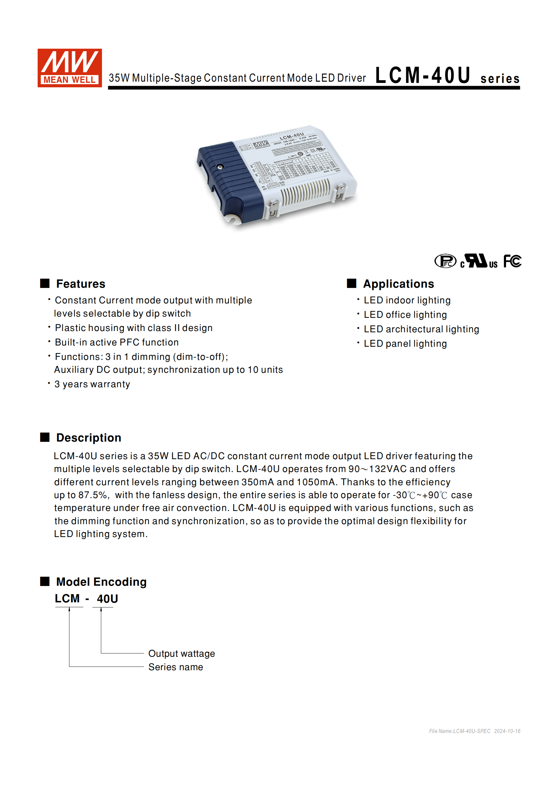 明緯LCM-40U 系列是額定功率35W的恒流型 LED 驅(qū)動(dòng)器,采用塑膠外殼 Class II 設(shè)計(jì),輸入電壓支持90~132VAC,輸出電流可通過(guò) DIP 開(kāi)關(guān)在350mA~1050mA間六檔選擇且出廠(chǎng)默認(rèn) 700mA,具備主動(dòng)式 PFC、三合一調(diào)光、10 臺(tái)同步、溫度補(bǔ)償及 12V 輔助直流輸出功能,轉(zhuǎn)換效率最高達(dá)87.5%,工作機(jī)殼溫度為 **-30℃~+90℃**,擁有短路、過(guò)壓、過(guò)溫保護(hù),通過(guò) UL8750 等安規(guī)認(rèn)證,MTBF 值優(yōu)異,質(zhì)保 3 年,適用于各類(lèi) LED 室內(nèi)、辦公、建筑及板燈照明場(chǎng)景。