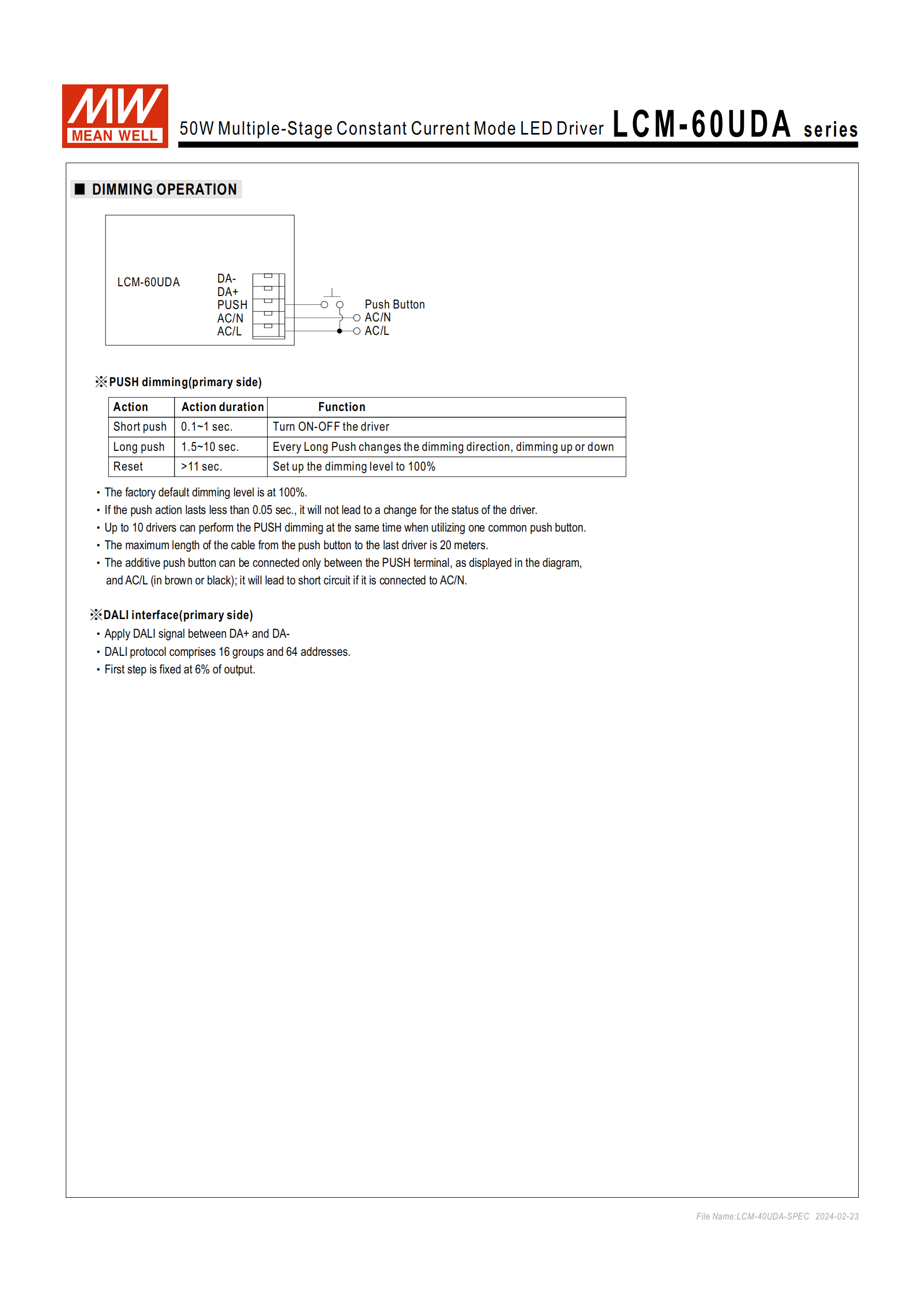 按壓調(diào)光:初級側(cè)實現(xiàn),短按(0.1~1s)控制開關(guān),長按(1.5~10s)切換調(diào)光方向,復(fù)位按(>11s)恢復(fù) 100% 亮度;單按鍵最多支持10 臺同步按壓調(diào)光,按鍵到最后一臺驅(qū)動器電纜最大20 米,按鈕僅可接 PUSH 終端與 AC/L。