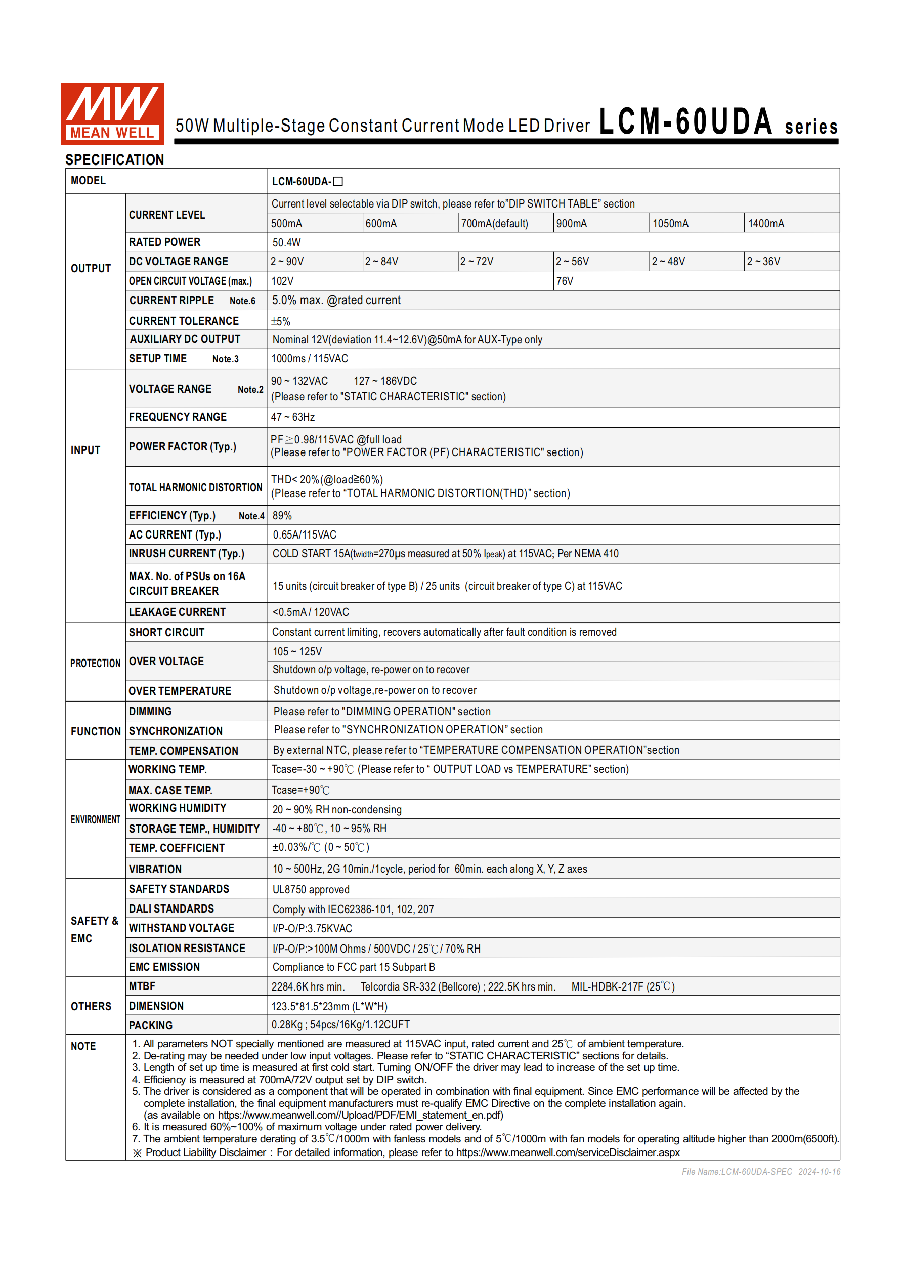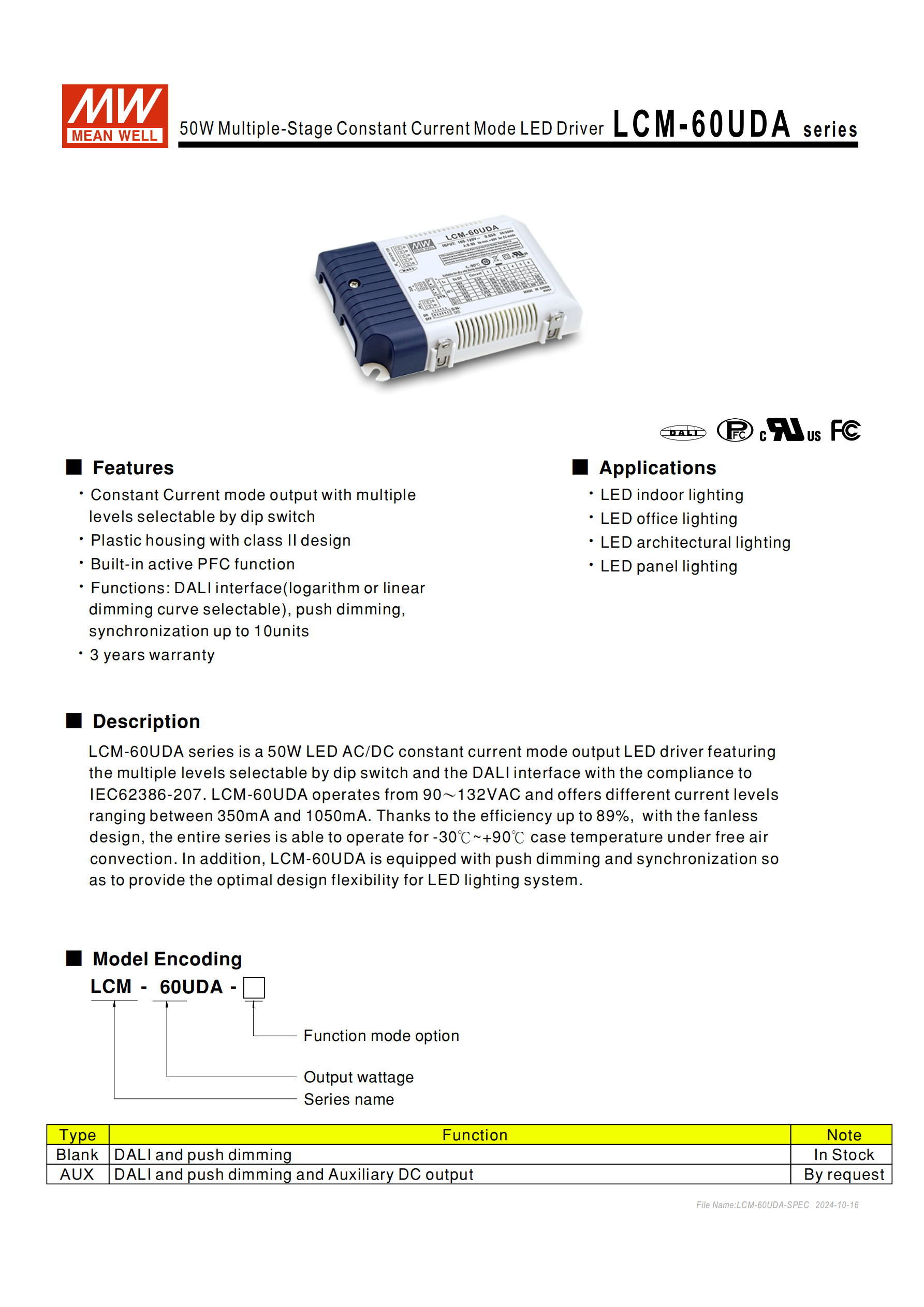 明緯 LCM-60UDA 系列為50W 多級輸出恒流型 LED 交流變直流驅(qū)動器,主打無風(fēng)扇自然風(fēng)冷設(shè)計,核心適配 LED 照明系統(tǒng),符合 IEC62386-207 標準,提供3 年保固,分為標準品(Blank)和AUX 選購品兩類,塑膠外殼搭配 Class II 設(shè)計,廣泛應(yīng)用于 LED 室內(nèi)、辦公、建筑、板燈照明場景。產(chǎn)品尺寸為123.581.523mm(LWH),單臺重 0.28Kg,包裝規(guī)格 54pcs/16Kg/1.12CUFT,MTBF 值達 2284.6K hrs min.(Telcordia SR-332)。