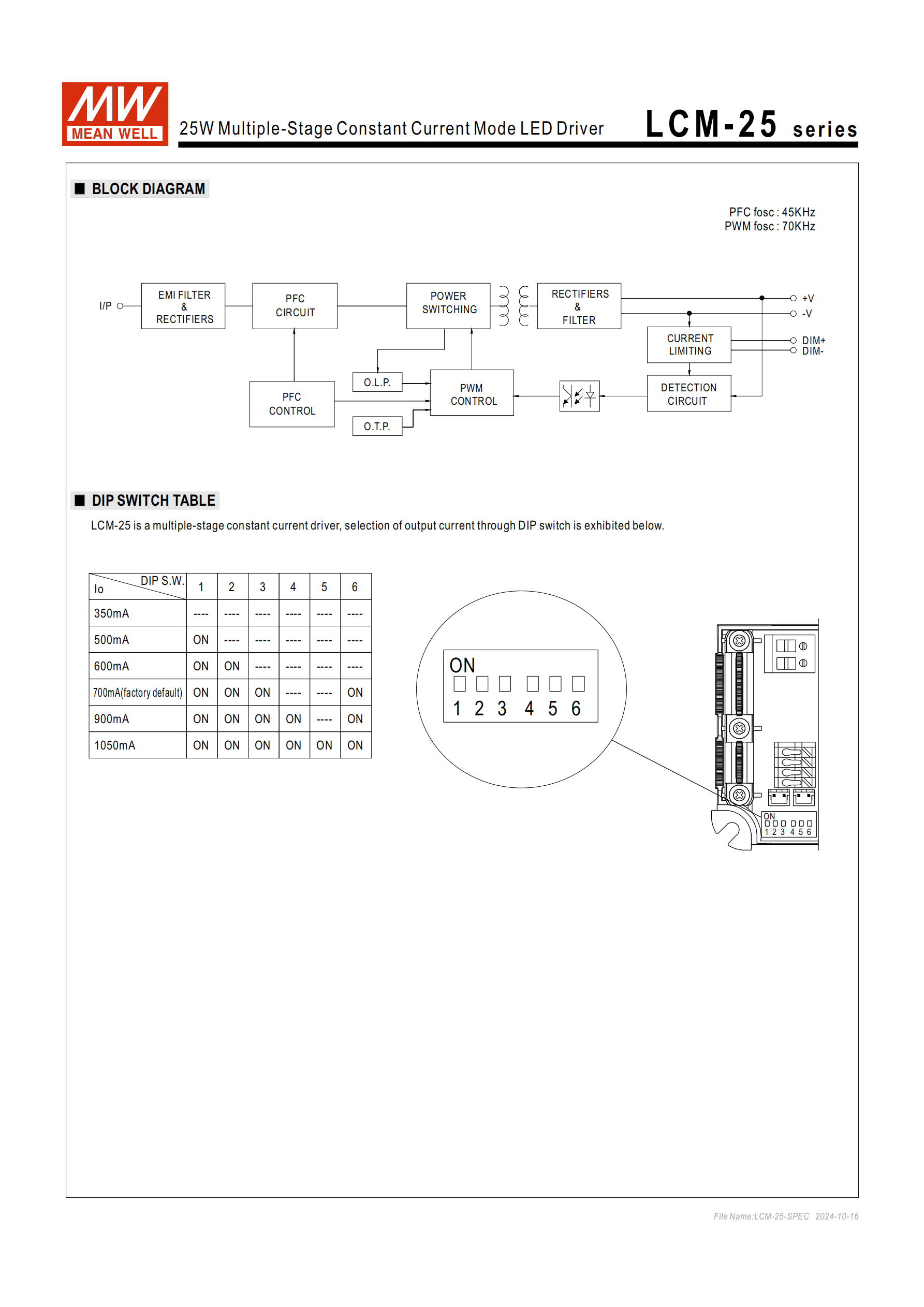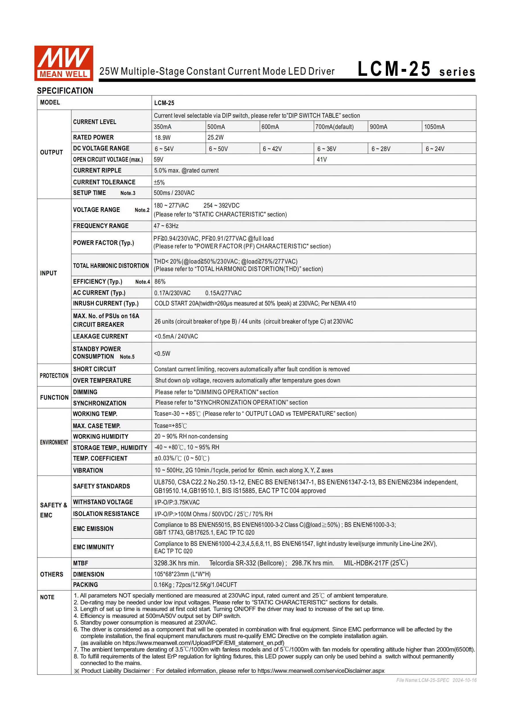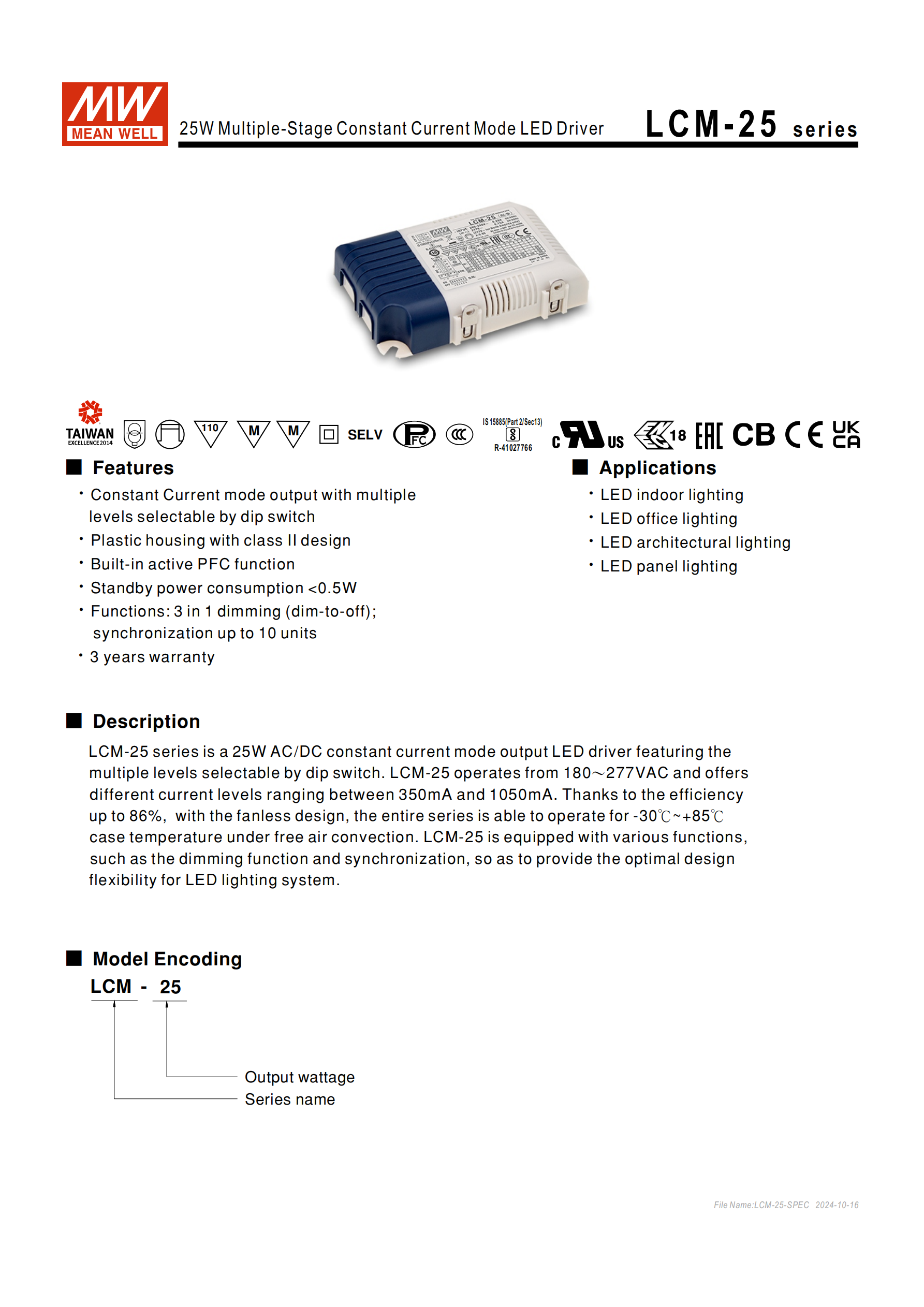 明緯LCM-25 系列是 25W 多級輸出恒流型 LED 驅(qū)動器,采用塑膠外殼 Class Ⅱ 設(shè)計,輸入電壓覆蓋180~277VAC,可通過 DIP 開關(guān)選擇350mA~1050mA六檔輸出電流,直流電壓范圍隨電流不同為 6~54V 至 6~24V,內(nèi)置主動式 PFC功能,擁有三合一調(diào)光和最多10 臺同步的功能,待機功耗 **<0.5W**,轉(zhuǎn)換效率最高86%,無風(fēng)扇設(shè)計可在 **-30℃~+85℃** 機殼溫度下自然風(fēng)冷工作,具備短路、過溫保護且可自動恢復(fù),通過多項安規(guī)認(rèn)證,提供 3 年保固,適用于各類 LED 室內(nèi)、辦公、建筑及板燈照明場景。