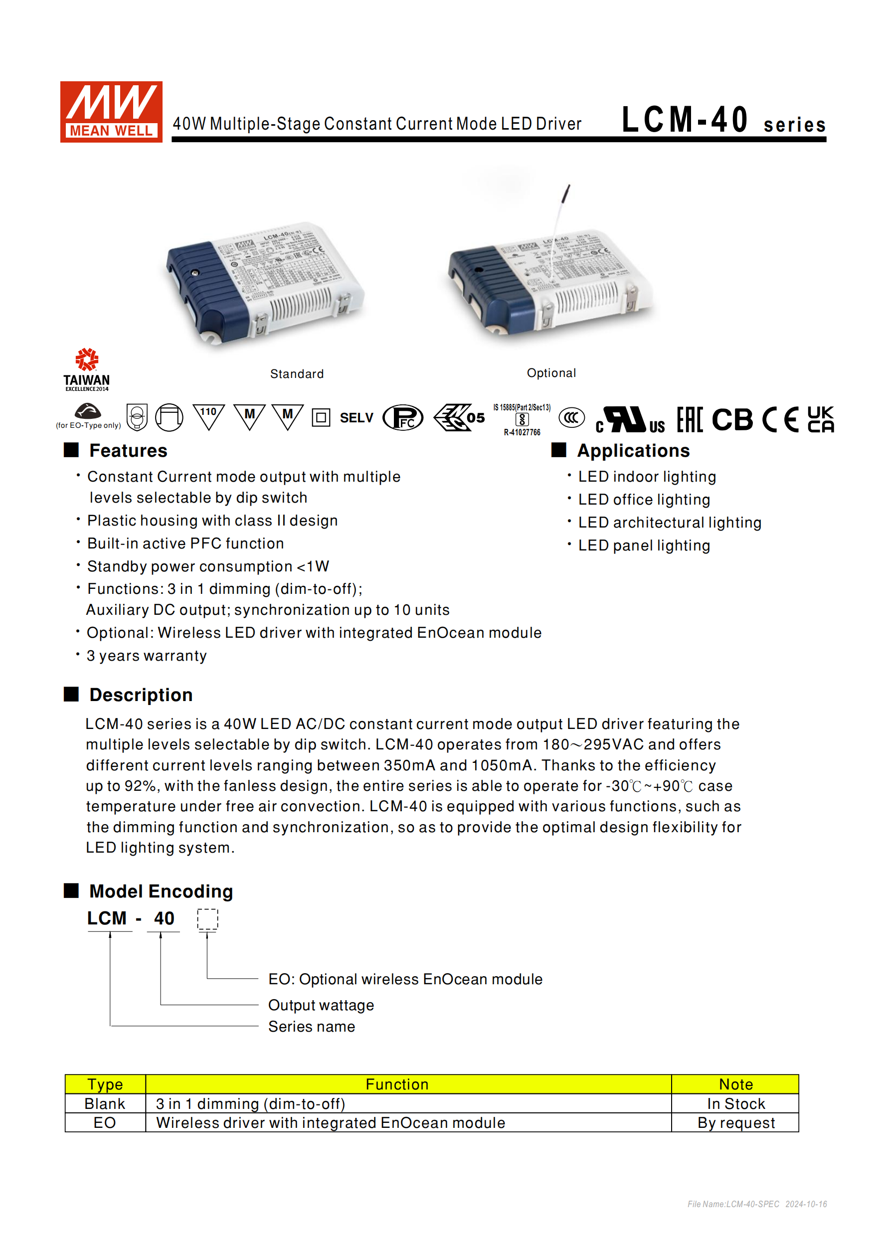 明緯LCM-40 系列為40W 多級輸出恒流型 LED 驅(qū)動器,交流轉(zhuǎn)直流設(shè)計,主打高適配性與多功能性,是 LED 照明系統(tǒng)的專用電源,分標(biāo)準(zhǔn)品(三合一調(diào)光)和EO 可選型(帶易能森 EnOcean 通訊模塊),提供 3 年保固,核心適用于 LED 室內(nèi)、辦公、建筑、板燈照明場景。