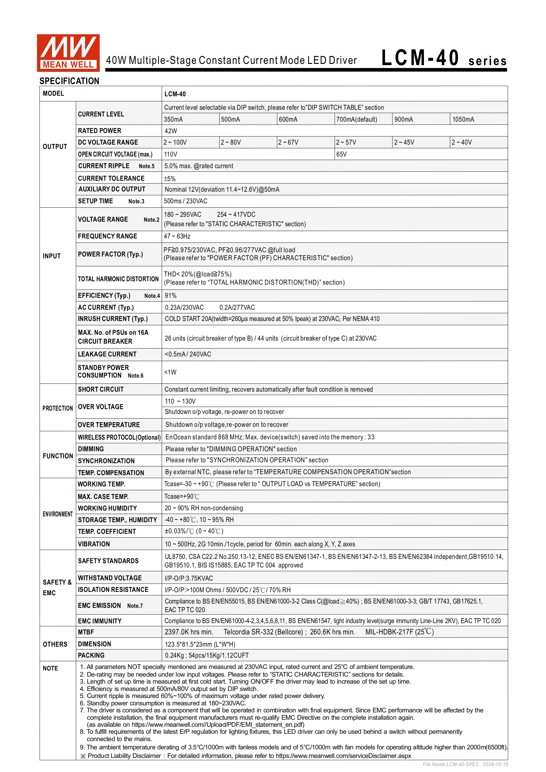明緯LCM-40 系列是 40W 多級輸出恒流型 LED 驅(qū)動器,輸入電壓為180~295VAC,可通過 DIP 開關(guān)選擇350mA~1050mA共 6 檔輸出電流,默認(rèn) 700mA,轉(zhuǎn)換效率最高達92%,具備三合一調(diào)光、10 臺同步、溫度補償、主動式 PFC 等功能,可選配易能森 EnOcean無線通訊模塊(868MHz 頻段),塑膠外殼為 Class II 設(shè)計,待機功耗 < 1W,工作溫度范圍 **-30℃~+90℃**,擁有短路、過壓、過溫多重保護,通過多項安規(guī)認(rèn)證,質(zhì)保 3 年,適用于 LED 室內(nèi)、辦公、建筑、板燈等照明場景。
