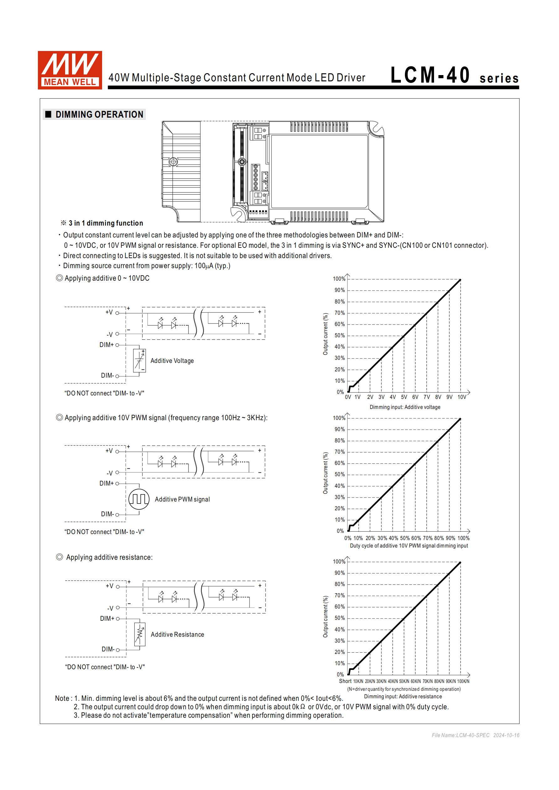 答案:三合一調(diào)光可通過三種方式實現(xiàn):①DIM+/DIM - 間接 0~10V 直流電壓;②接 10V PWM 信號(頻率 100Hz~3KHz);③外接電阻(EO 型通過 SYNC+/SYNC - 調(diào)光)。關(guān)鍵注意事項:①請勿將 DIM - 與 - V 連接;②最小調(diào)光比例約 6%,0%<Iout<6% 時電流精度無定義,0V/0 占空比 / 0Ω 時輸出電流可降為 0%;③進行調(diào)光操作時不可激活溫度補償功能;④調(diào)光端口輸出電流典型值為 100μA。