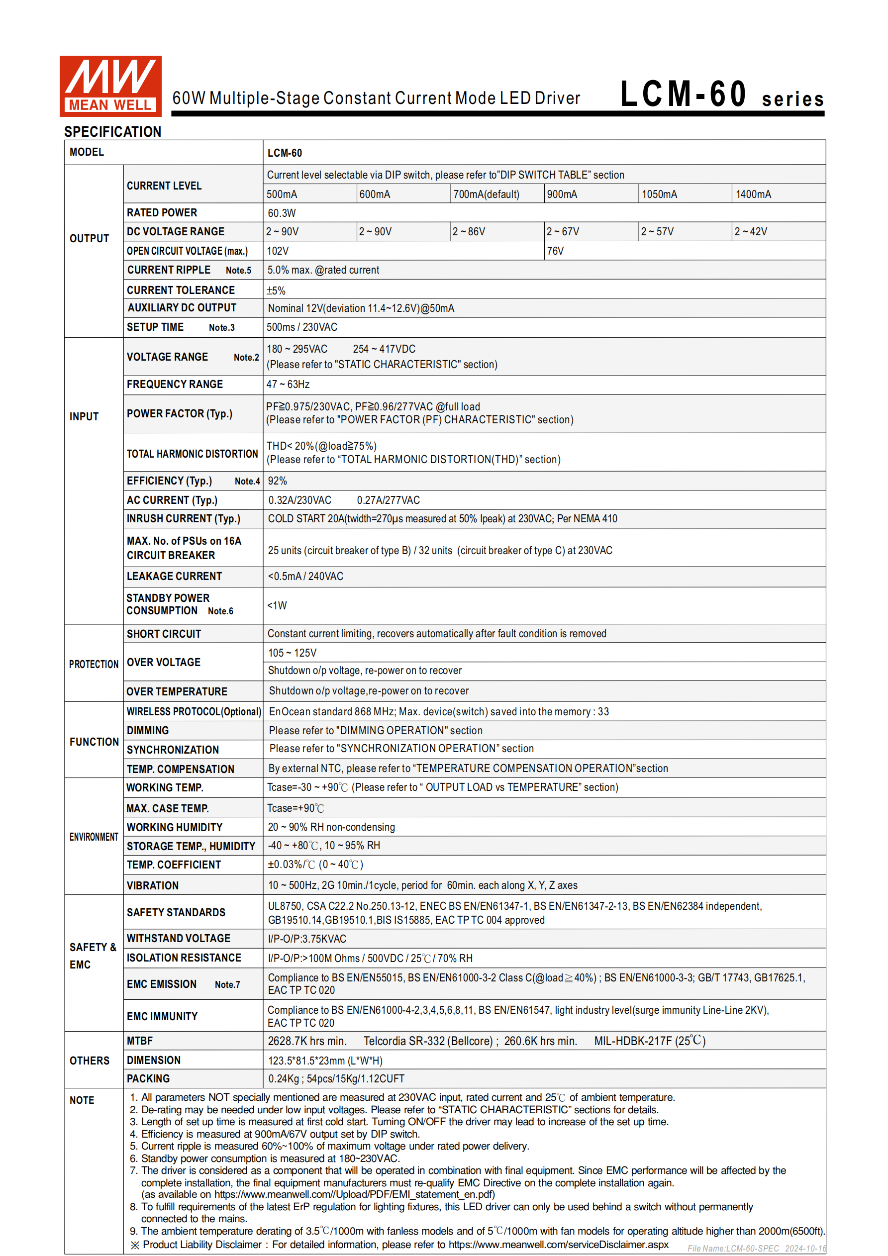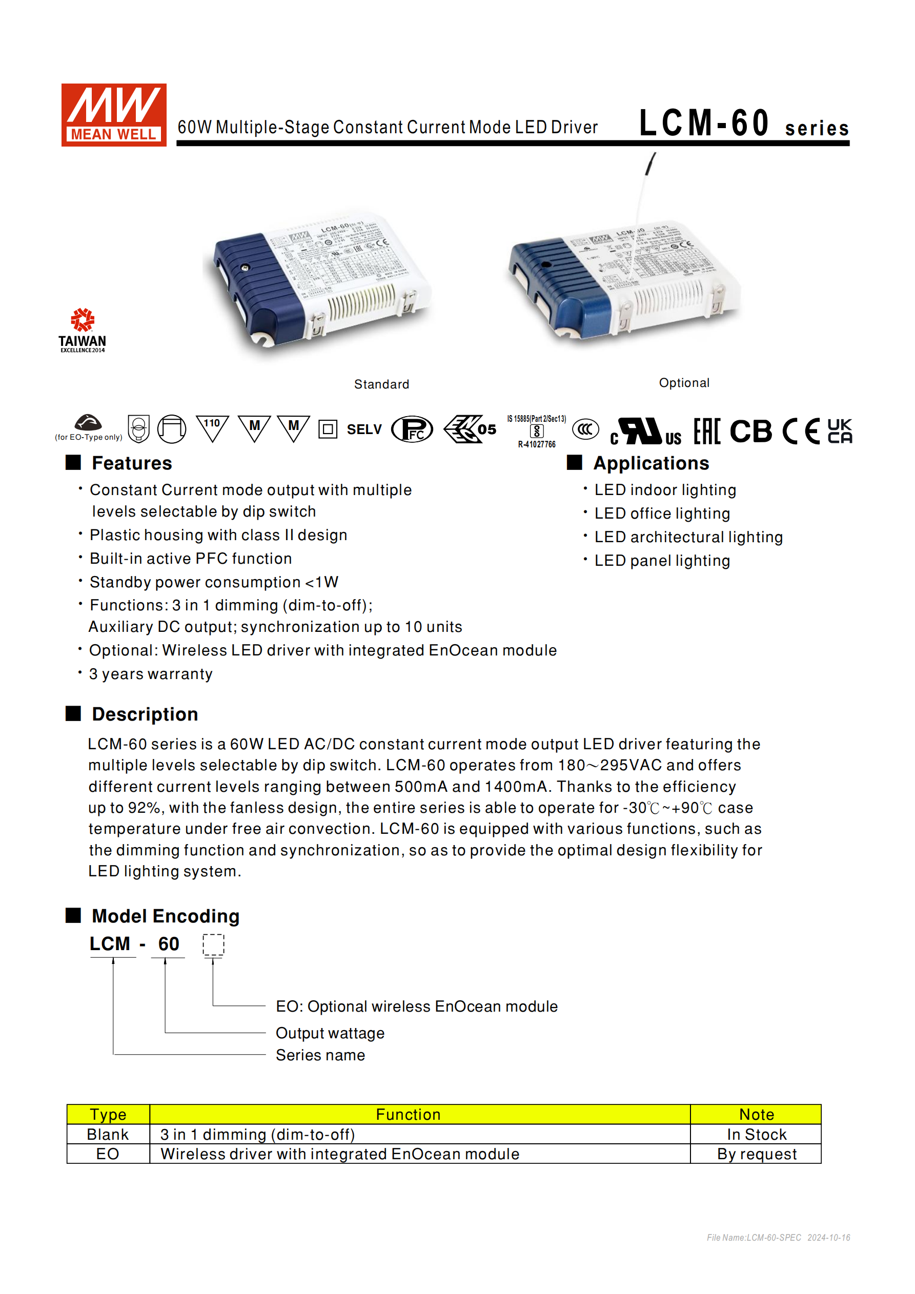 明緯LCM-60 系列是 60W 交流變直流恒流型 LED 驅(qū)動(dòng)器,輸入電壓覆蓋180~295VAC,輸出電流可通過 DIP 開關(guān)在500mA~1400mA間多檔位選擇,標(biāo)配三合一調(diào)光、10 臺(tái)同步、溫度補(bǔ)償及12V 輔助直流輸出功能,可選易能森 EnOcean 無線通訊模塊(EO 型),具備主動(dòng)式 PFC、待機(jī)功耗 **<1W**、轉(zhuǎn)換效率最高92% 等特性,采用塑膠外殼 Class II 設(shè)計(jì),無風(fēng)扇自然風(fēng)冷,工作溫度 **-30℃~+90℃**,通過多項(xiàng)國際安規(guī)認(rèn)證,提供 3 年保固,主要應(yīng)用于 LED 室內(nèi)、辦公、建筑及板燈照明場景。
