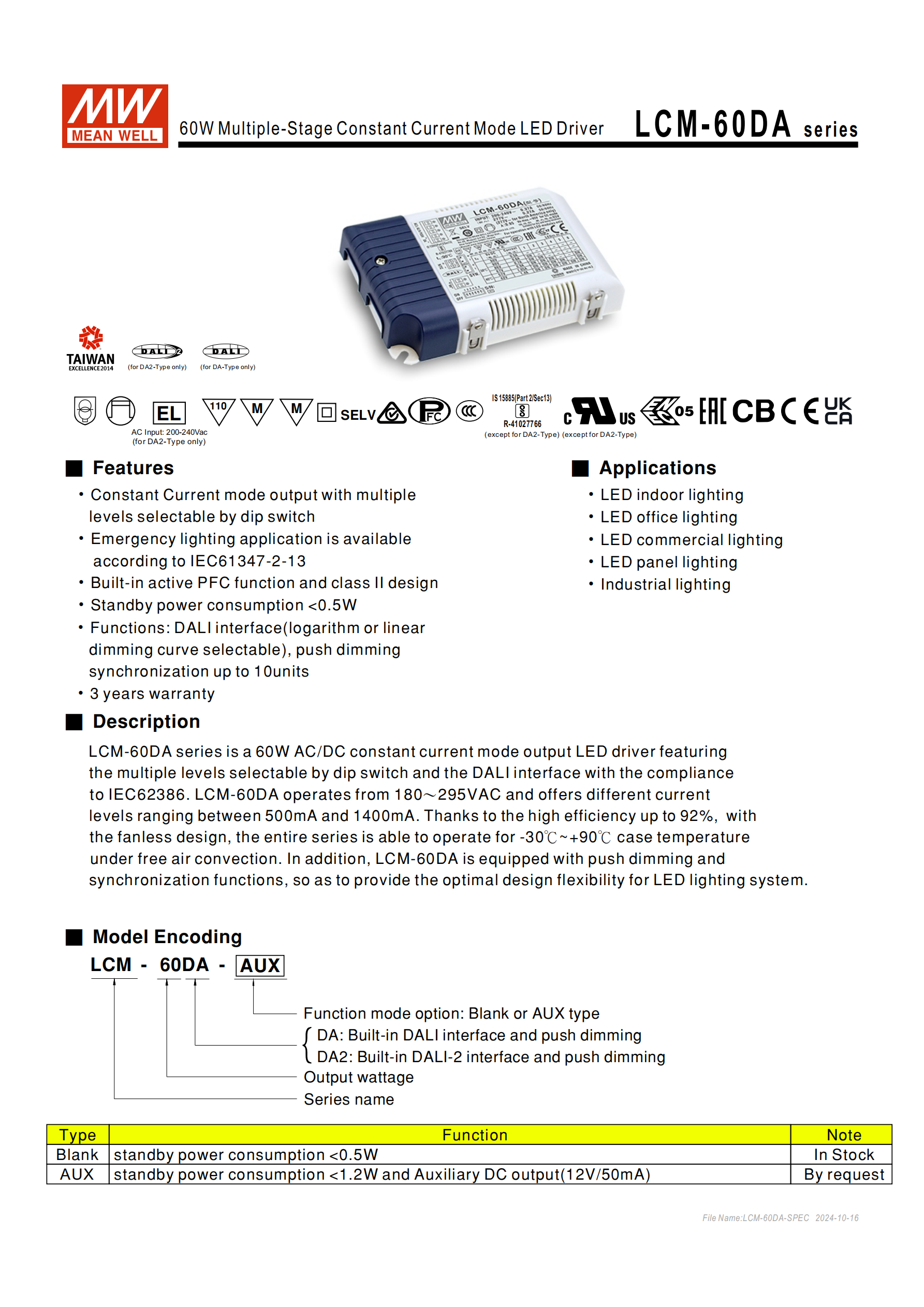 核心認證:UL8750(DA2 除外)、CSA C22.2 No.250.13-12、ENEC、GB19510.1/14、BIS IS15885(DA2 除外)、EAC 等;
