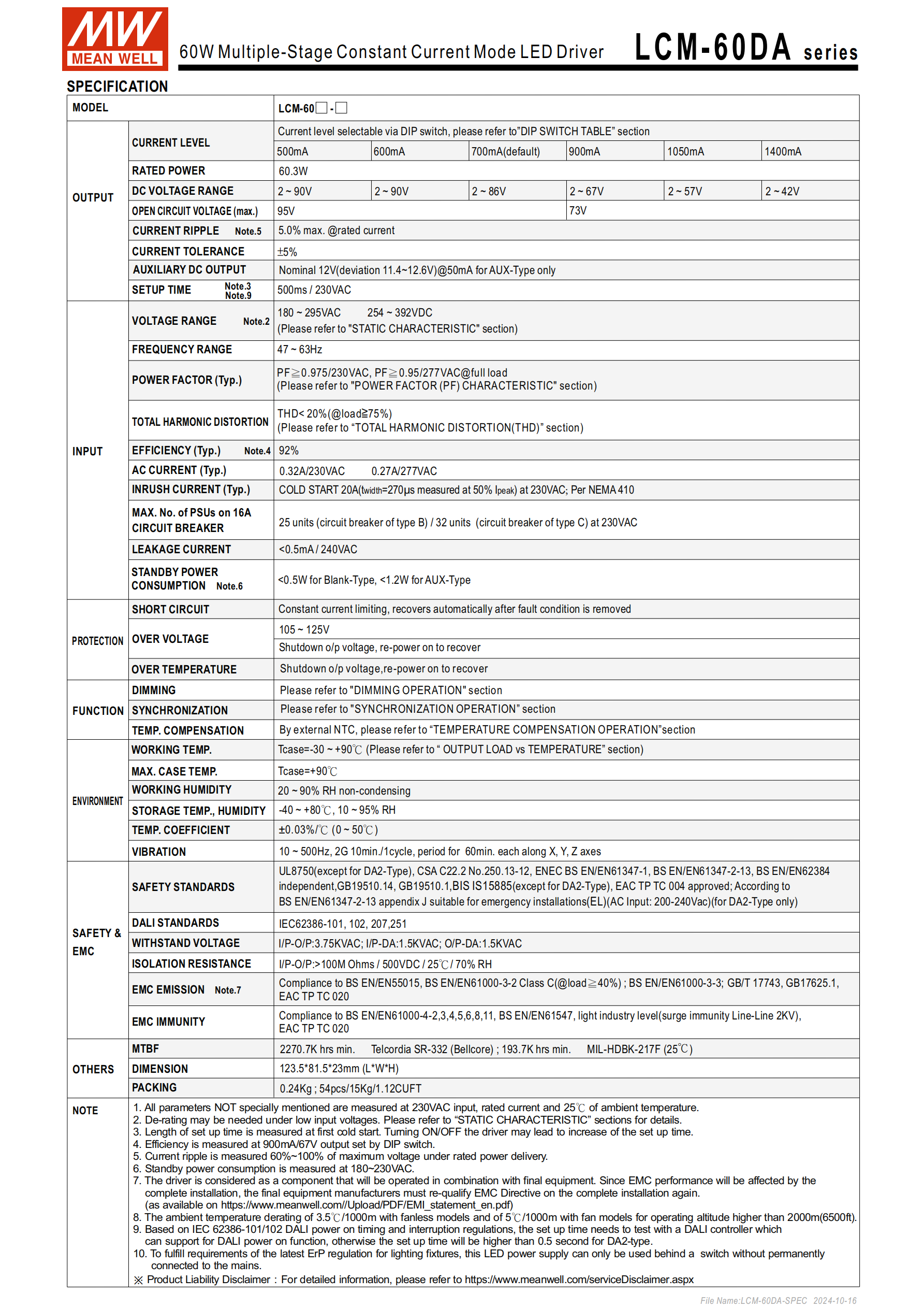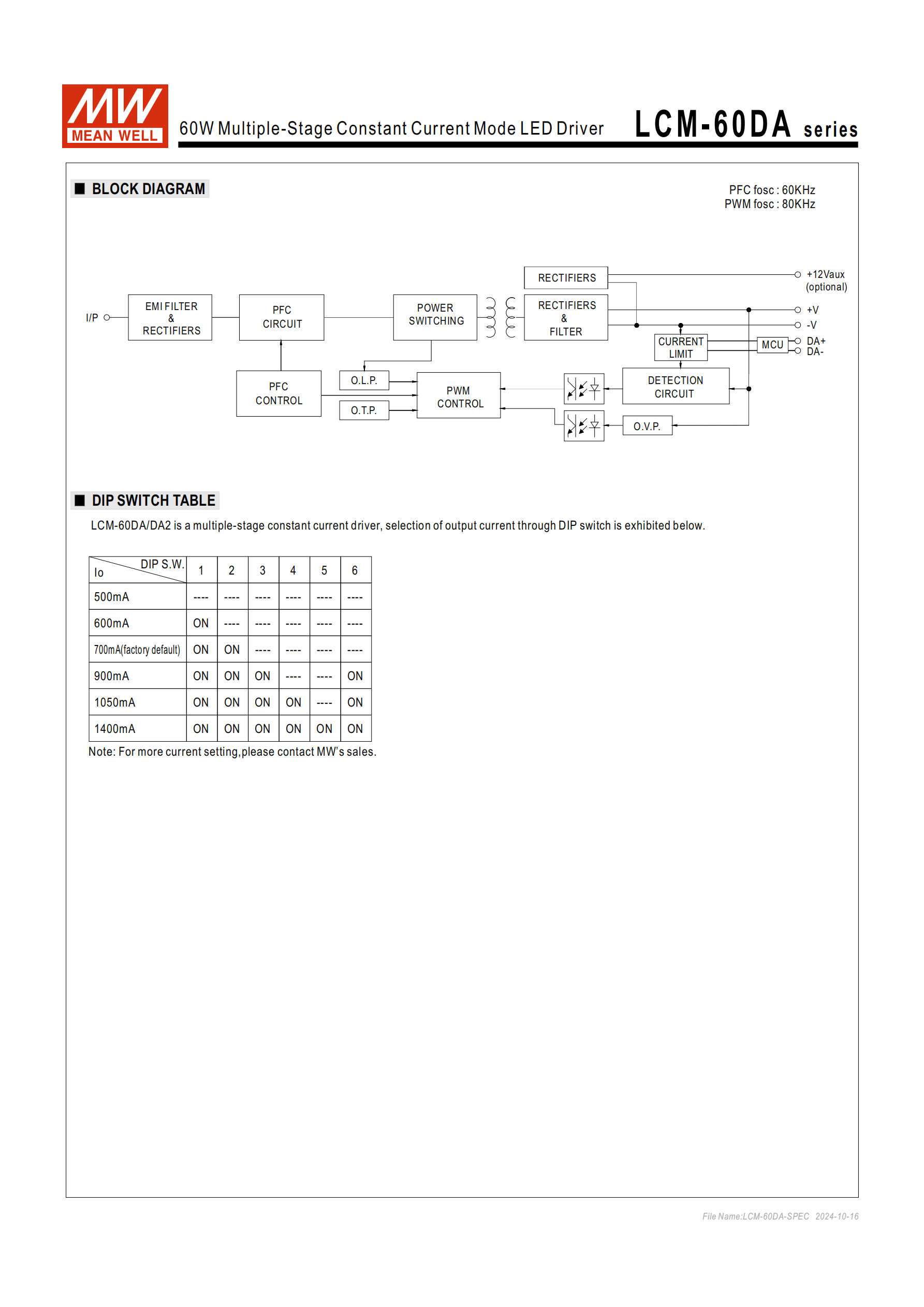 明緯LCM-60DA 系列是 60W 多級輸出恒流型 LED 驅(qū)動器,分 DA/DA2 型、Blank/AUX 款,輸入電壓180~295VAC(DA2 型為 200-240Vac),輸出電流可通過 DIP 開關(guān)在500mA~1400mA間調(diào)節(jié),直流電壓范圍 2~90V,轉(zhuǎn)換效率最高92%,內(nèi)置主動式 PFC、DALI 界面(符合 IEC62386)及按壓調(diào)光功能,支持10 臺同步調(diào)光、溫度補償,待機功耗 Blank 型 < 0.5W、AUX 型 < 1.2W,工作機殼溫度 **-30℃~+90℃**,無風(fēng)扇自然風(fēng)冷設(shè)計,通過多項國際認證,提供 3 年保固,適用于各類 LED 室內(nèi)、辦公、建筑及工業(yè)照明場景。