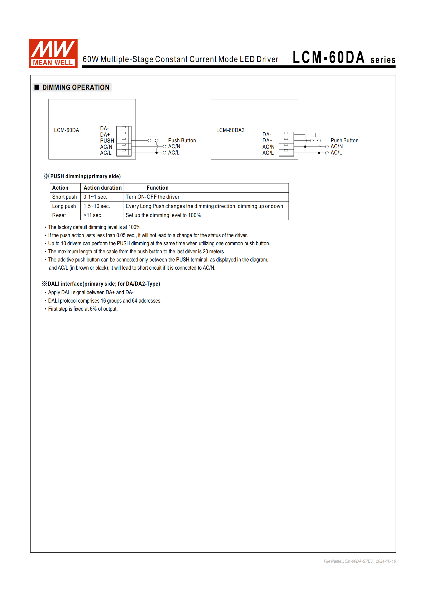 | DA2 | 內(nèi)建 DALI-2 界面 + 按鍵調(diào)光 | 輸入電壓 200~240Vac,適用于緊急設(shè)備 EL | 適配特定緊急照明 | |