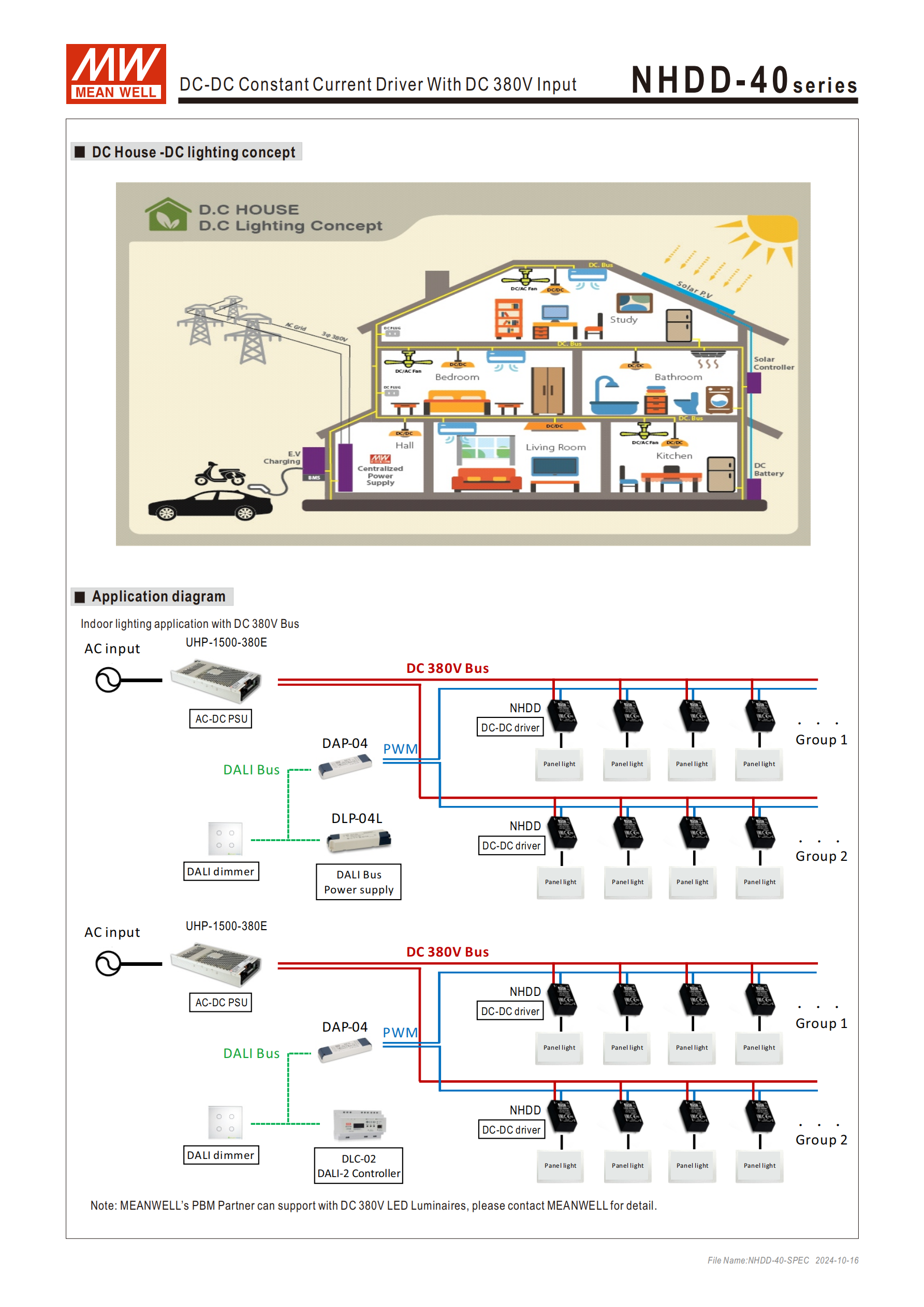 可搭配明緯 AC-DC 電源(UHP-1500-380E)、DALI 調光器(DLP-04L)、控制器(DLC-02)等組成 380V 直流總線室內照明方案。