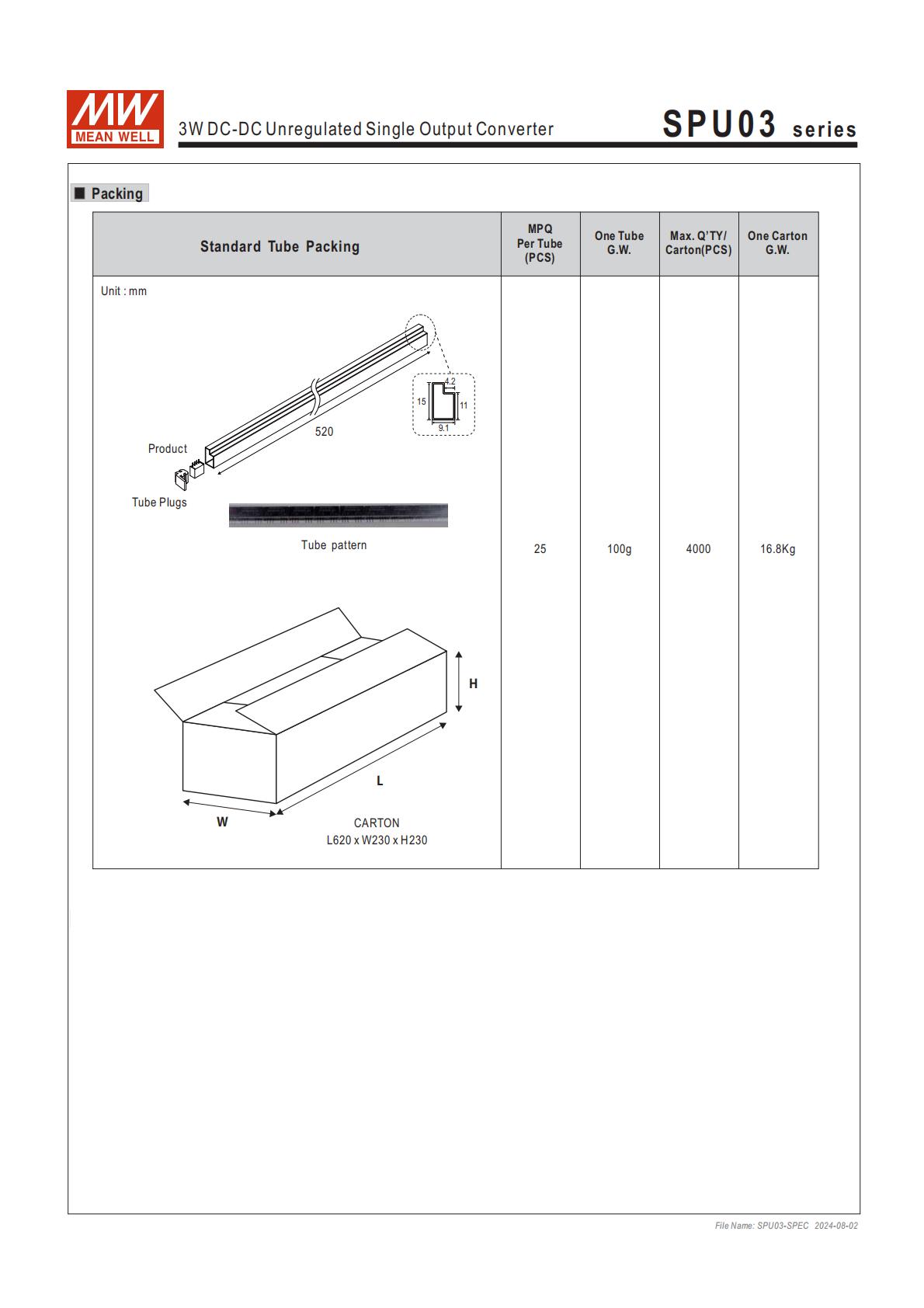 問題:SPU03 系列不同輸出電壓型號的最高效率分別是多少,包裝與品控保障有哪些?答案:5V 輸出型號最高效率 83%(SPU03M-05/SPU03N-05),12V 輸出型號最高效率 86%(SPU03M-12/SPU03N-12),15V 輸出型號最高效率 88%(SPU03N-15);品控上做到 100% 滿載老化,提供 2 年保固;包裝為套管標(biāo)準(zhǔn)包裝,25 顆 / 管、4000 顆 / 160 管 / 箱,整箱毛重 16.8Kg。