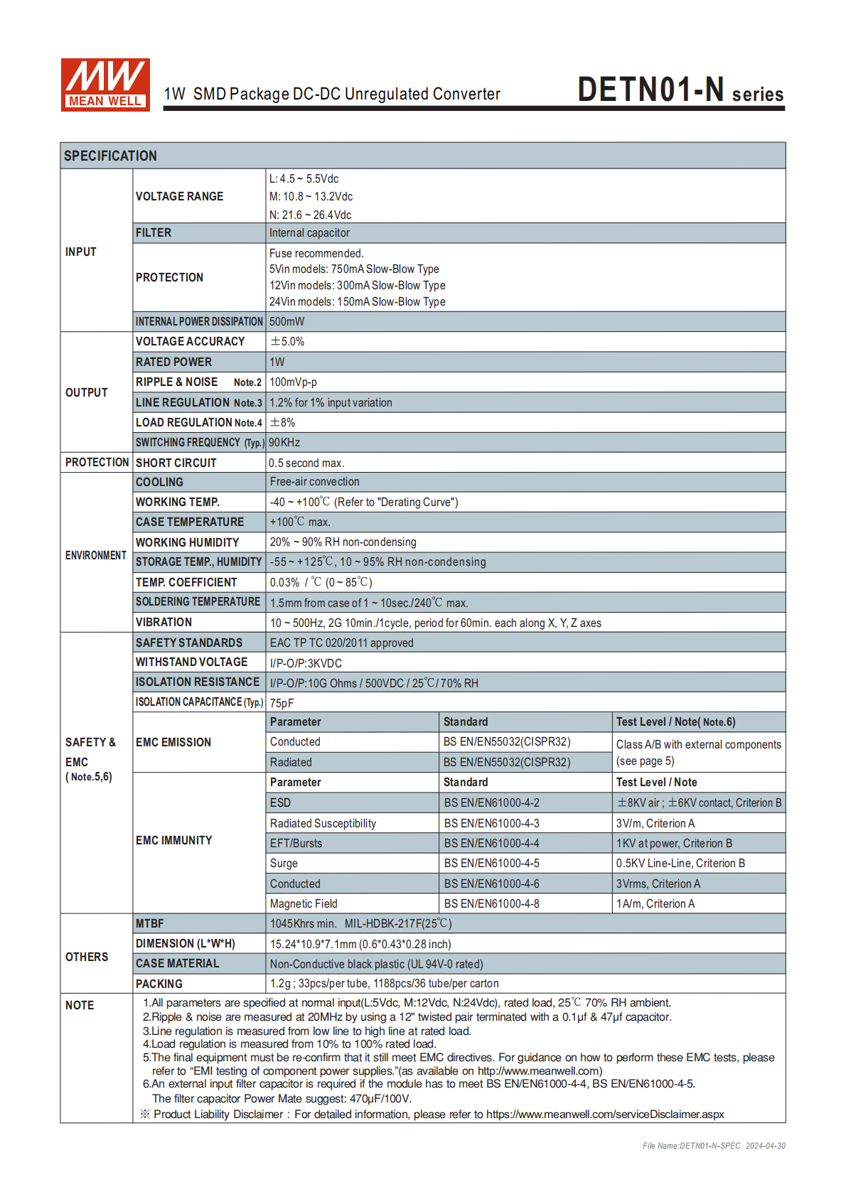 | DETN01N-15N | 21.6~26.4V | ±15V | ±3.4~34mA | 11mA | 82% | 100μF |