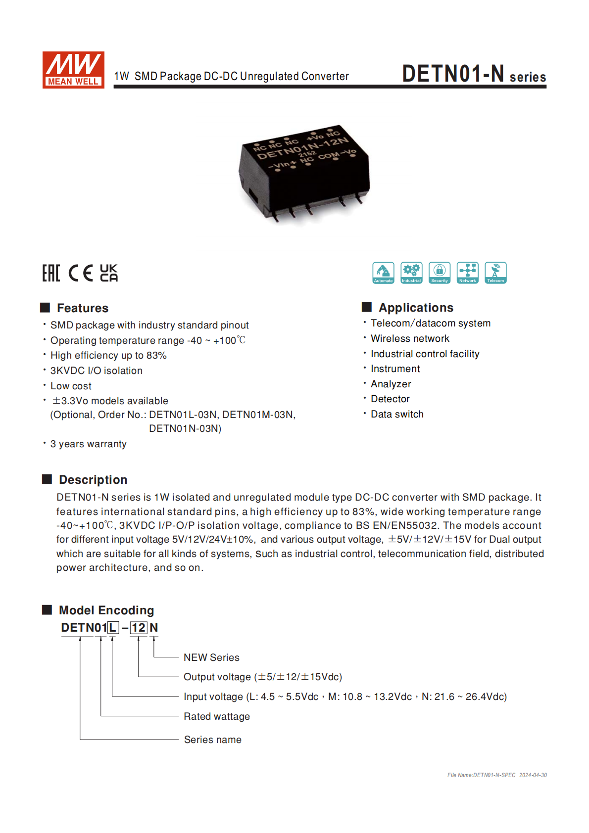 DETN01-N 系列是明緯推出的1W SMD 封裝DC-DC 非穩(wěn)壓隔離轉(zhuǎn)換器,擁有工業(yè)標準引腳,工作溫度覆蓋 **-40~+100℃,輸入輸出隔離達3KVDC**,效率最高83%,提供 L/M/N 三類輸入電壓范圍(4.5~5.5V/10.8~13.2V/21.6~26.4V)及 **±5V/±12V/±15V雙組輸出,適配電信通信、工業(yè)控制等多場景,具備 3 年保固,各項電氣、環(huán)境、安規(guī)指標完善,封裝尺寸為15.2410.97.1mm**,支持自然風冷,MTBF 最小值達1045Khrs。
