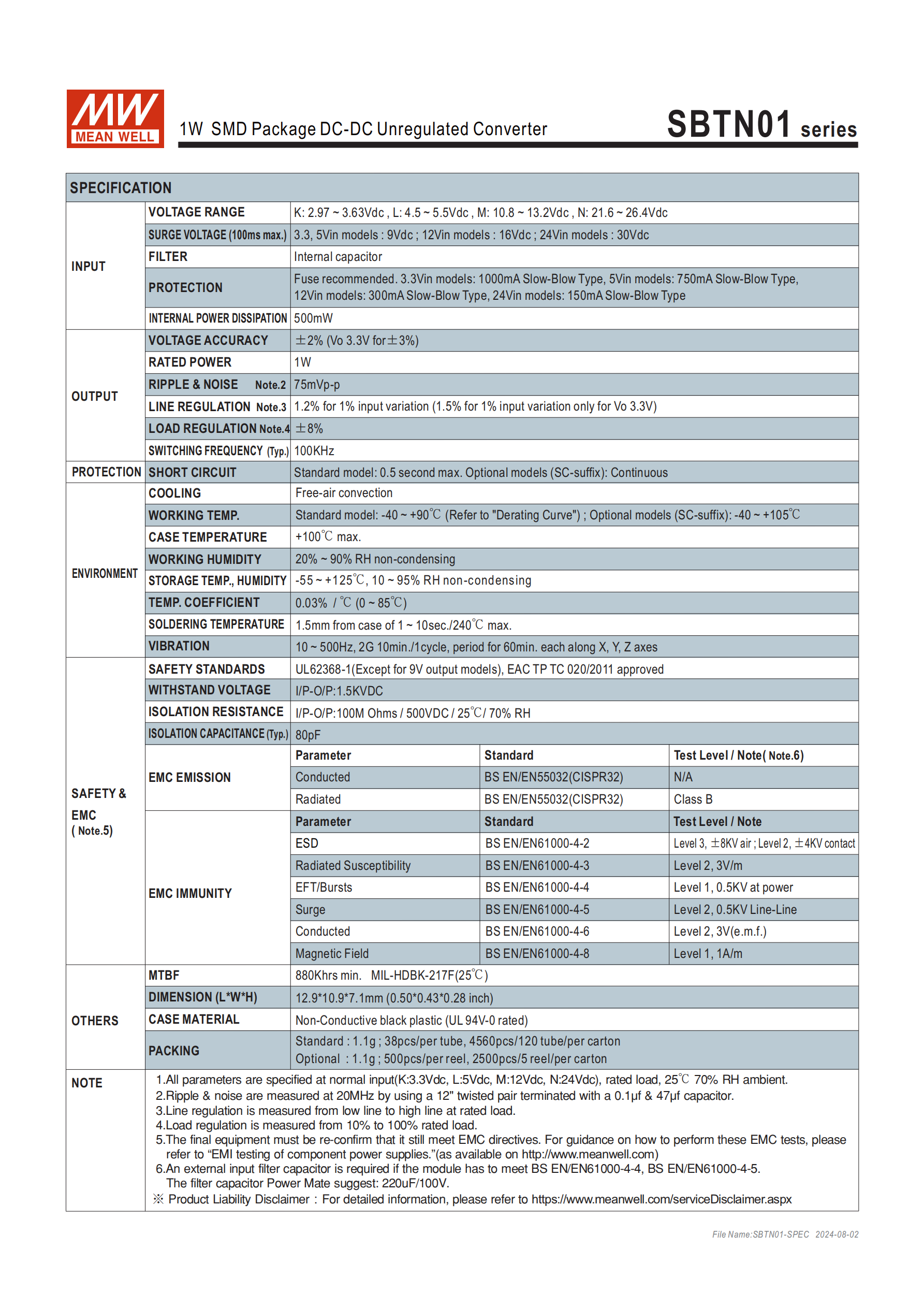 EMC 建議電路元件配置| 機型系列 | Class A | Class B ||----------|---------|---------|| DETN02L-xxN | L1=10μH,C1=4.7μF | L1=22μH,C1=4.7μF || DETN02M-xxN | L1=3.3μH,C1=2.2μF | L1=10μH,C1=2.2μF || DETN02N-xxN | L1=22μH,C1=2.2μF | L1=47μH,C1=2.2μF |