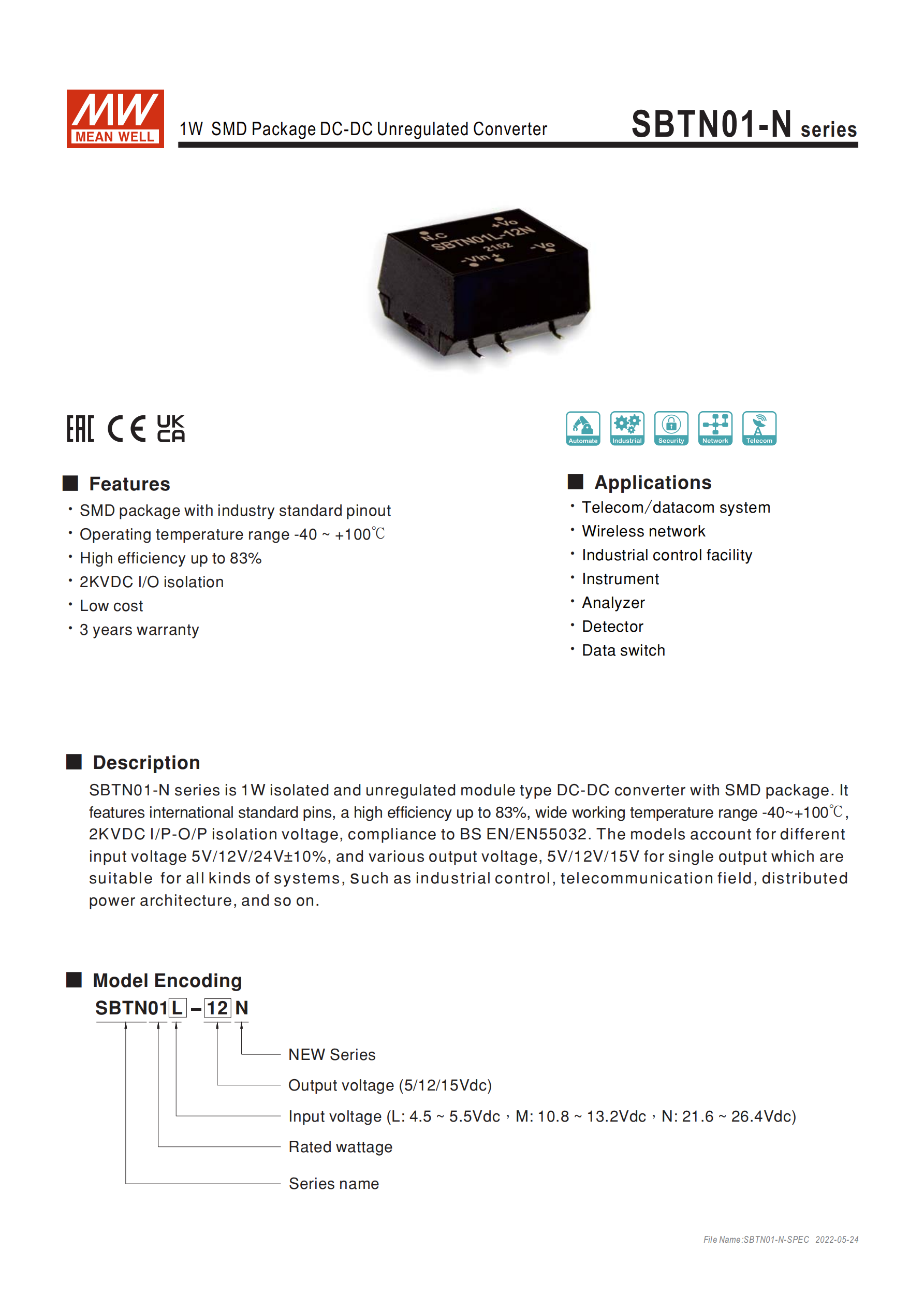 SBTN01 系列是明緯推出的1W SMD 封裝 DC-DC 非穩(wěn)壓轉換器,具備工業(yè)標準引腳,核心特性包含 **-40~+90℃(SC 款 - 40~+105℃)寬溫工作 **、最高 84% 轉換效率、1.5KVDC 輸入輸出隔離(3KVDC 可選)、BS EN/EN55032 輻射 B 級認證及短路保護,輸入電壓分 K/L/M/N 四檔對應不同范圍,輸出涵蓋 3.3V/5V/9V/12V/15V/24V 等規(guī)格,MTBF 達 880Khrs,尺寸僅12.910.97.1mm,適用于電信 / 工業(yè)控制 / 儀器等領域,提供 3 年保固,有套管和卷盤兩種包裝形式。