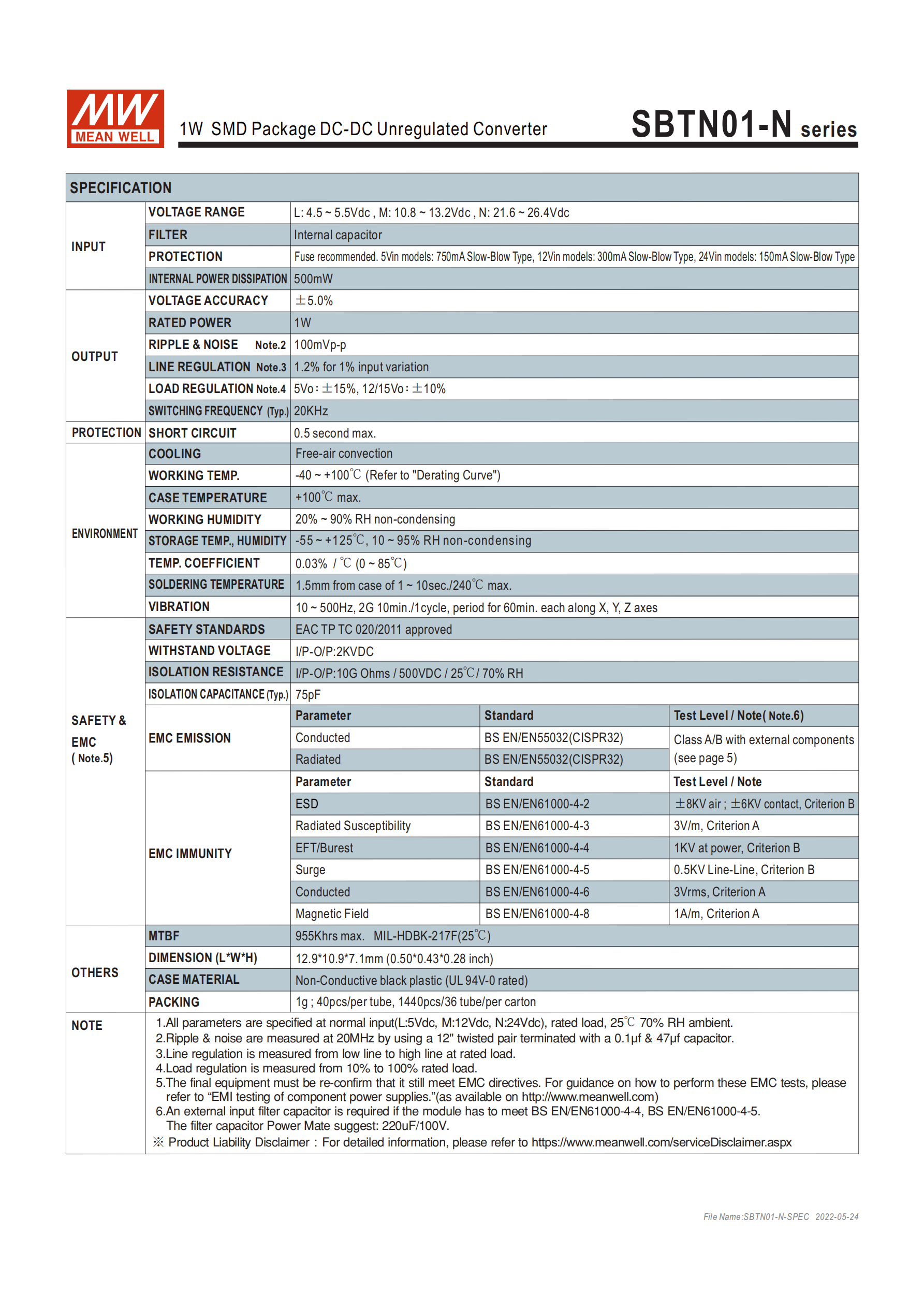 SBTN01+輸入電壓代碼+輸出電壓+規(guī)格后綴,其中輸入電壓分 4 檔,輸出電壓涵蓋 3.3V/5V/9V/12V/15V/24Vdc,規(guī)格后綴空白為標準品、SC 為可選品;輸入電壓檔位(含浪涌電壓):| 輸入代碼 | 額定電壓范圍 | 浪涌電壓(最長 100ms) | 推薦慢熔保險絲規(guī)格 ||----------|--------------|----------------------|--------------------|| K | 2.97~3.63Vdc | 9Vdc(3.3Vin 通用)| 1000mA || L | 4.5~5.5Vdc | 9Vdc(5Vin 通用)| 750mA || M | 10.8~13.2Vdc | 16Vdc(12Vin 通用)| 300mA || N | 21.6~26.4Vdc | 30Vdc(24Vin 通用)| 150mA |