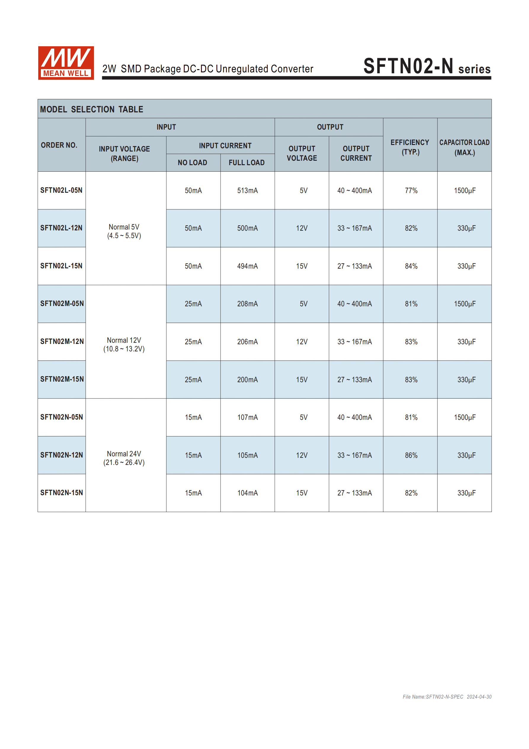 | SFTN02M-12N | 10.8~13.2Vdc | 12Vdc | 206mA | 15mA | 83% | 330μF |