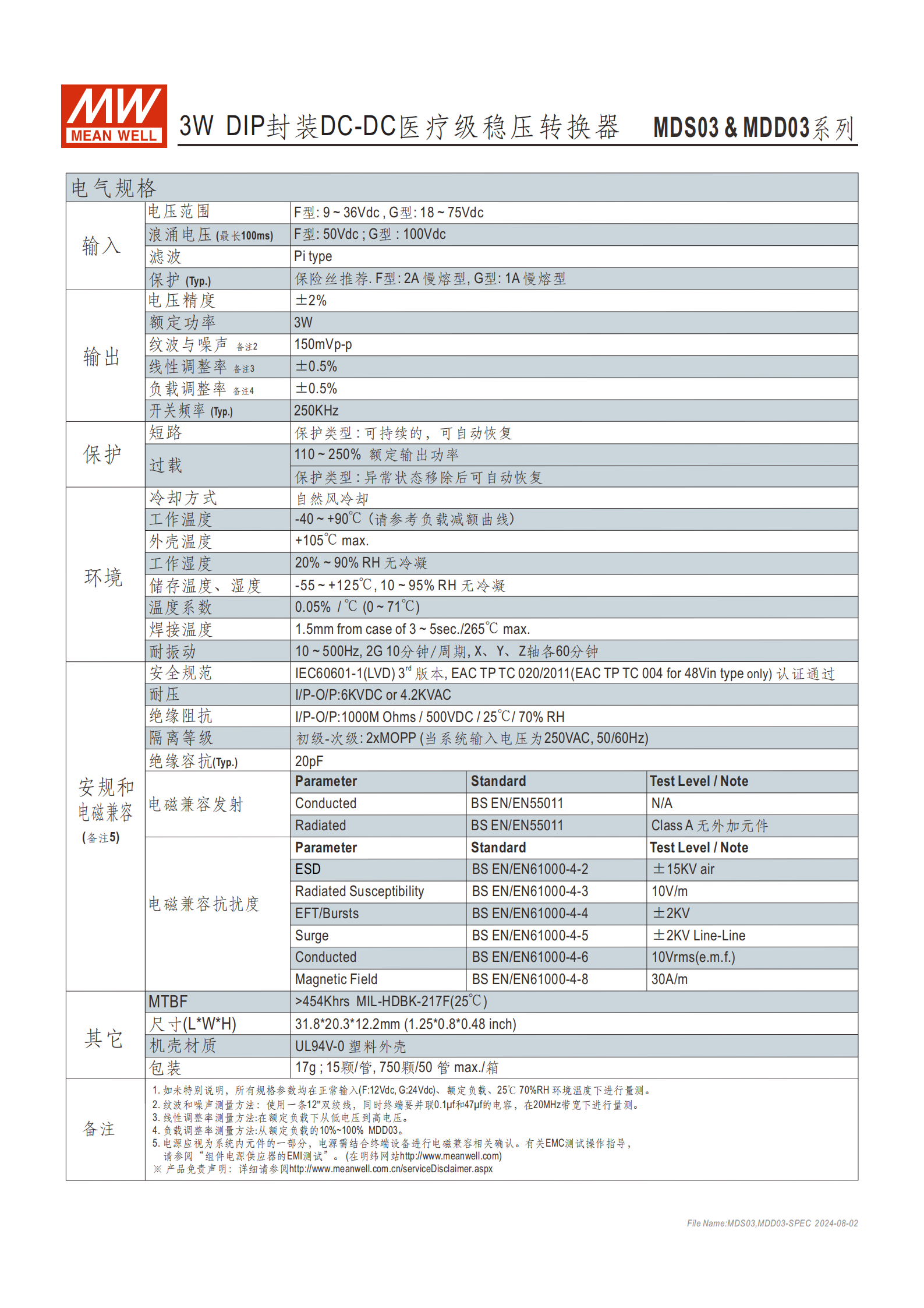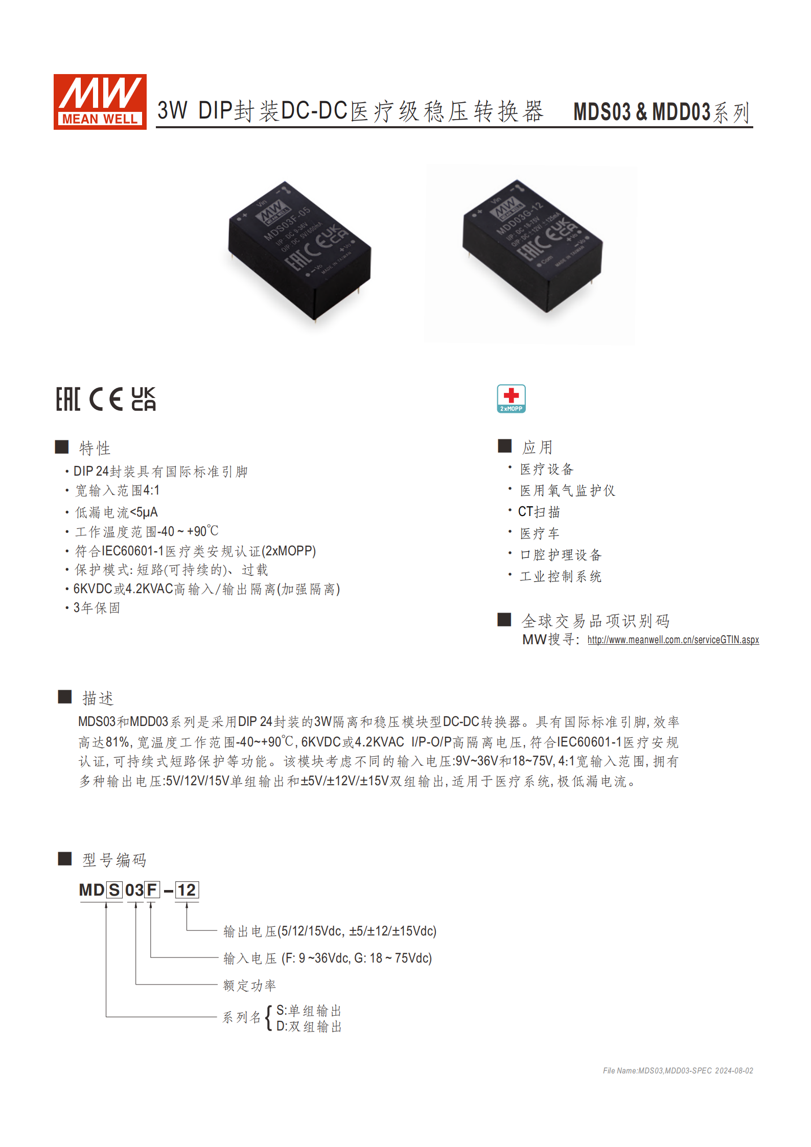 產品分F/G 輸入型、MDS03 單組輸出 / MDD03 雙組輸出,核心輸出與電流規(guī)格如下: