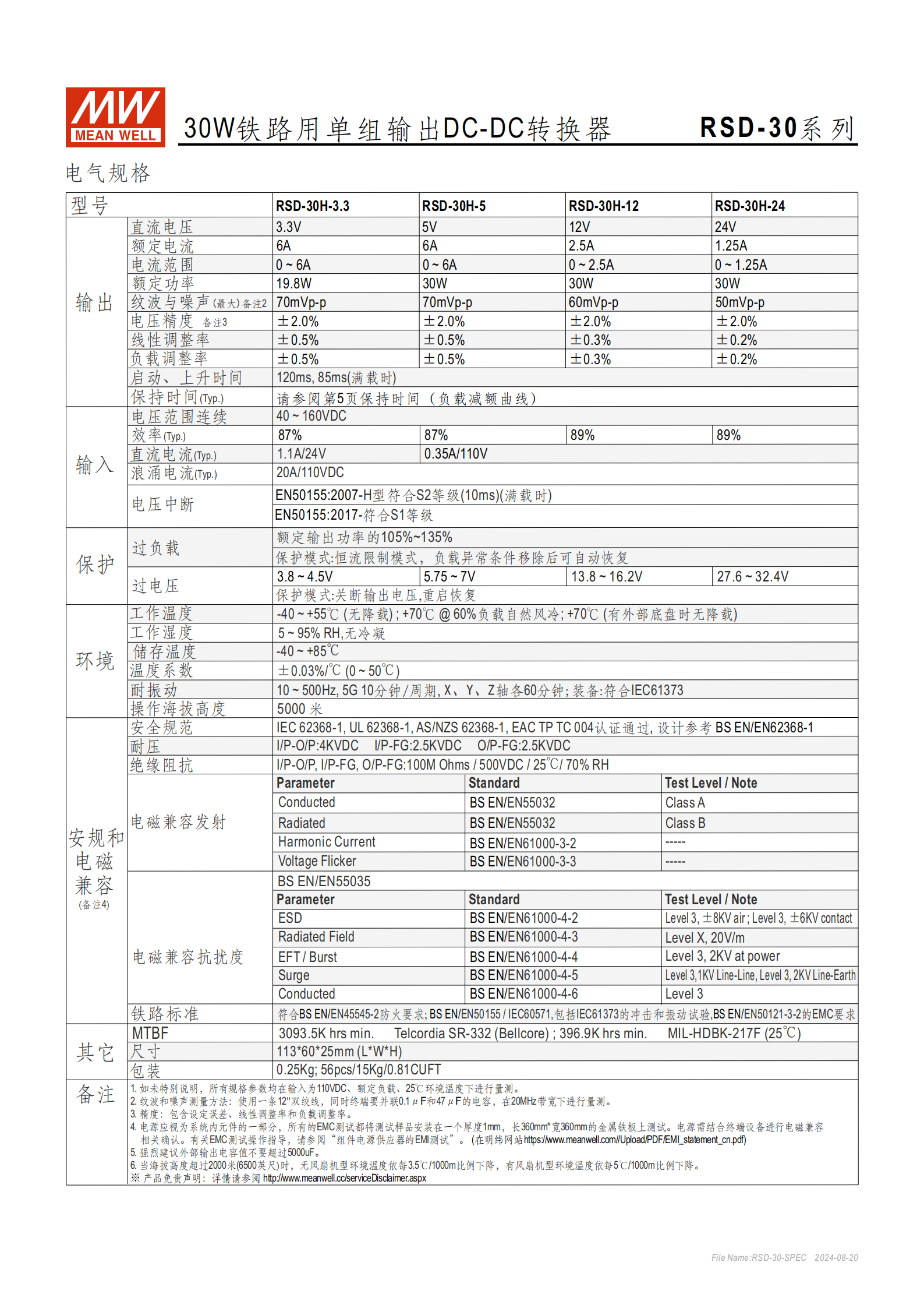 RSD-30 系列是明緯推出的 30W 鐵路用單組輸出 DC-DC 轉(zhuǎn)換器,擁有G/L/H 三種型號(hào)對(duì)應(yīng) 9~36VDC、18~72VDC、40~160VDC 的4:1 寬輸入范圍,輸出電壓可選 3.3V/5V/12V/24V,具備 **-40~+70℃寬工作溫度 **、4000VDC 輸入輸出加強(qiáng)隔離等特性,通過EN50155、EN45545-2等鐵路專用認(rèn)證,擁有短路 / 過負(fù)載等多重保護(hù),采用 1U 外型(1136025mm)、灌半膠設(shè)計(jì),自然風(fēng)冷,無最小負(fù)載要求,MTBF 達(dá)3093.5K hrs(Telcordia SR-332),適用于鐵路、有軌電車等運(yùn)輸系統(tǒng)及高振動(dòng)、高灰塵的惡劣環(huán)境,提供 3 年保固。