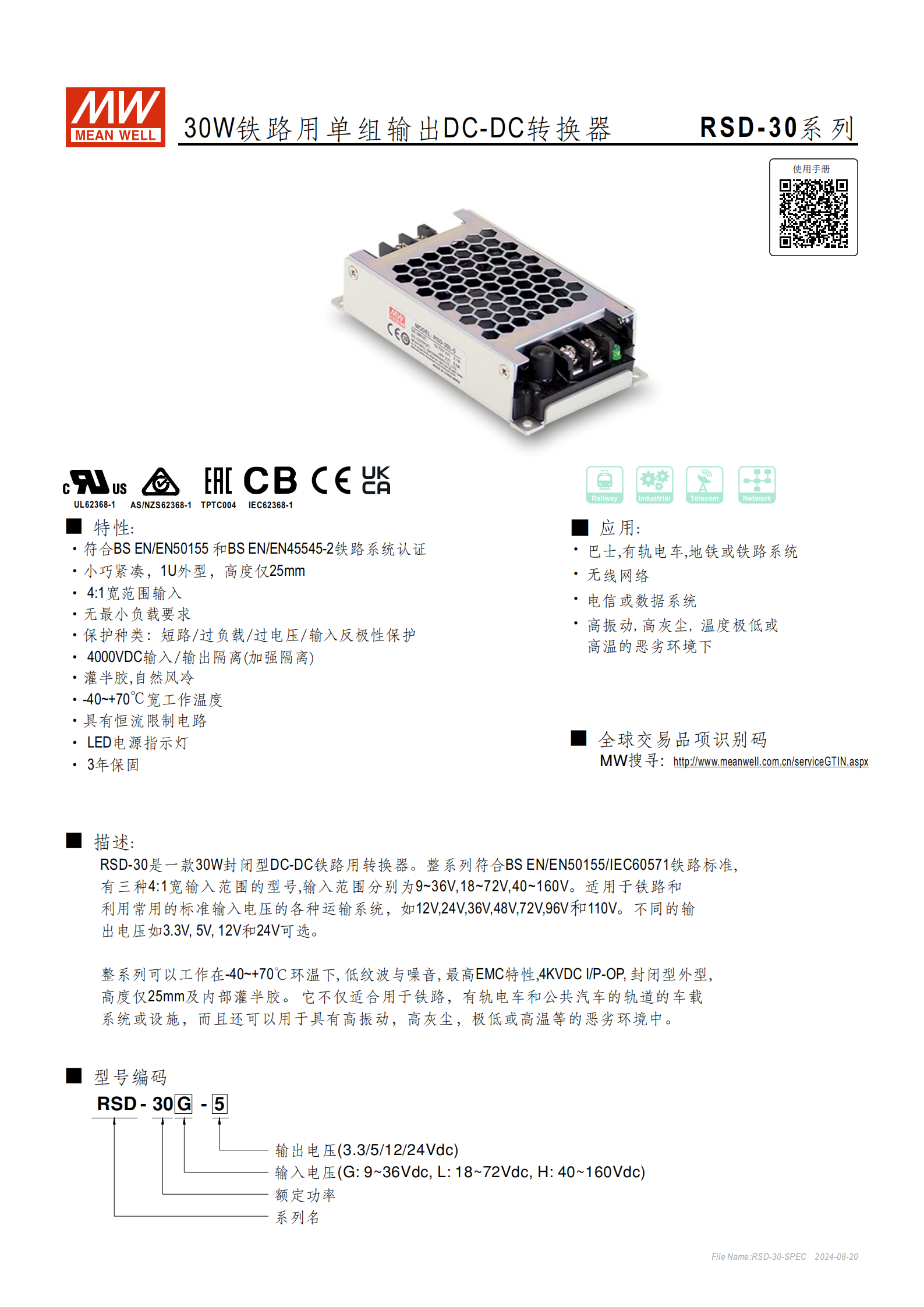 RSD-30 系列為明緯研發(fā)的30W 封閉型鐵路專用單組輸出 DC-DC 轉(zhuǎn)換器,主打軌道交通及惡劣環(huán)境應用,采用灌半膠、1U 外型設計,高度僅 25mm,自然風冷散熱,無最小負載要求,提供3 年保固,單臺重量 0.25Kg,包裝規(guī)格 56pcs/15Kg/0.81CUFT,全球交易品項識別碼可通過明緯官網(wǎng)查詢。