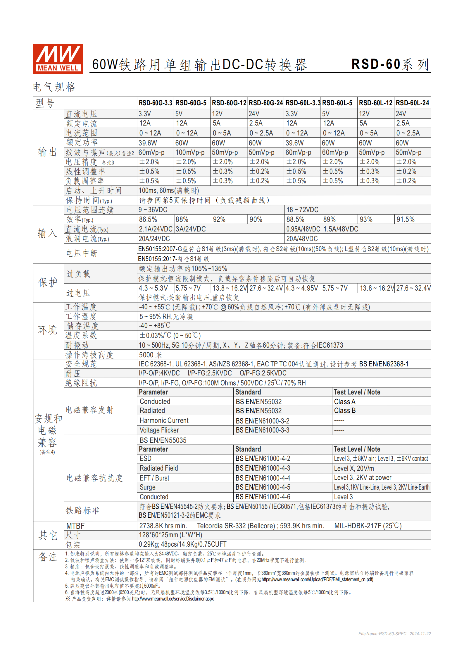 RSD-60 系列分G/L/H 三大類,共 12 個(gè)具體型號(hào),核心區(qū)分在于輸入電壓范圍,每類均提供 3.3V/5V/12V/24V 四種輸出電壓選擇,以下是全型號(hào)清單及對(duì)應(yīng)核心參數(shù),所有參數(shù)均為標(biāo)準(zhǔn)值(無(wú)特殊說(shuō)明時(shí),輸入 24/48VDC、額定負(fù)載、25℃環(huán)境下測(cè)量):