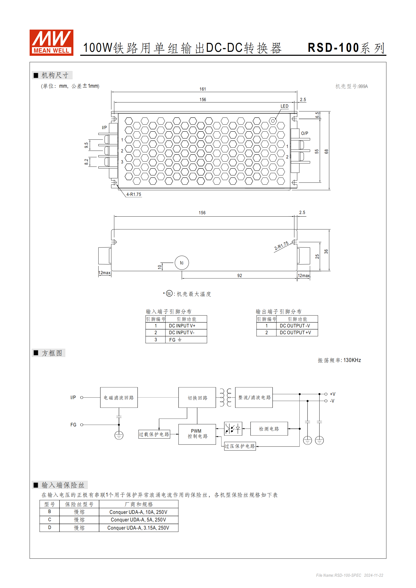| RSD-100D-12 | 12V | 8.4A | 91% | Conquer UDA-A 3.15A/250V | 寬輸入57.6~154VDC |