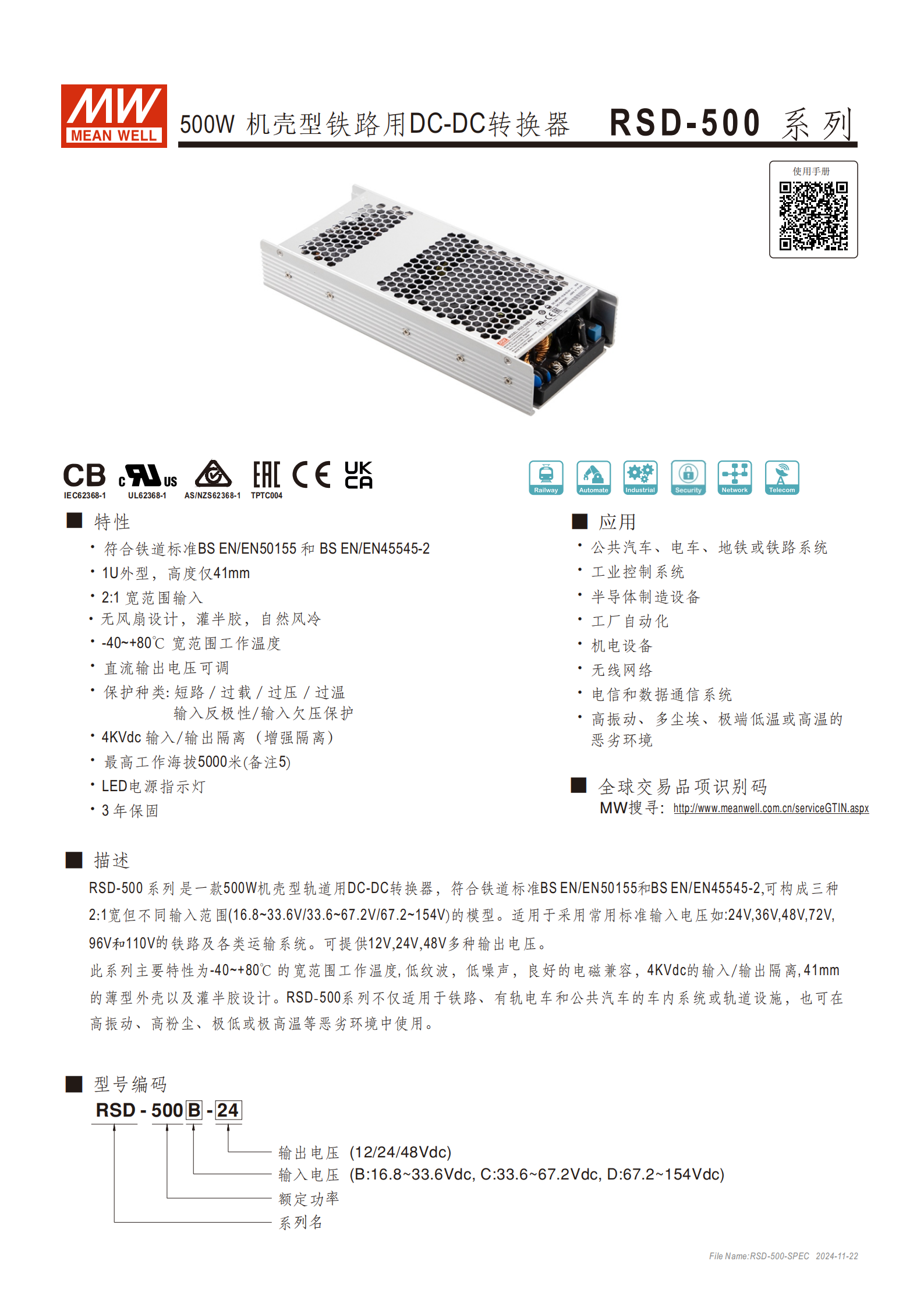 RSD-500 系列為明緯生產的500W 機殼型鐵路專用 DC-DC 轉換器,是面向軌道交通及惡劣工業(yè)環(huán)境的電源轉換產品,核心符合鐵道標準EN50155(2017 版)EN45545-2,同時通過IEC62368-1、UL62368-1、AS/NZS62368-1等安規(guī)認證,提供3 年保固,為全球交易品項。
