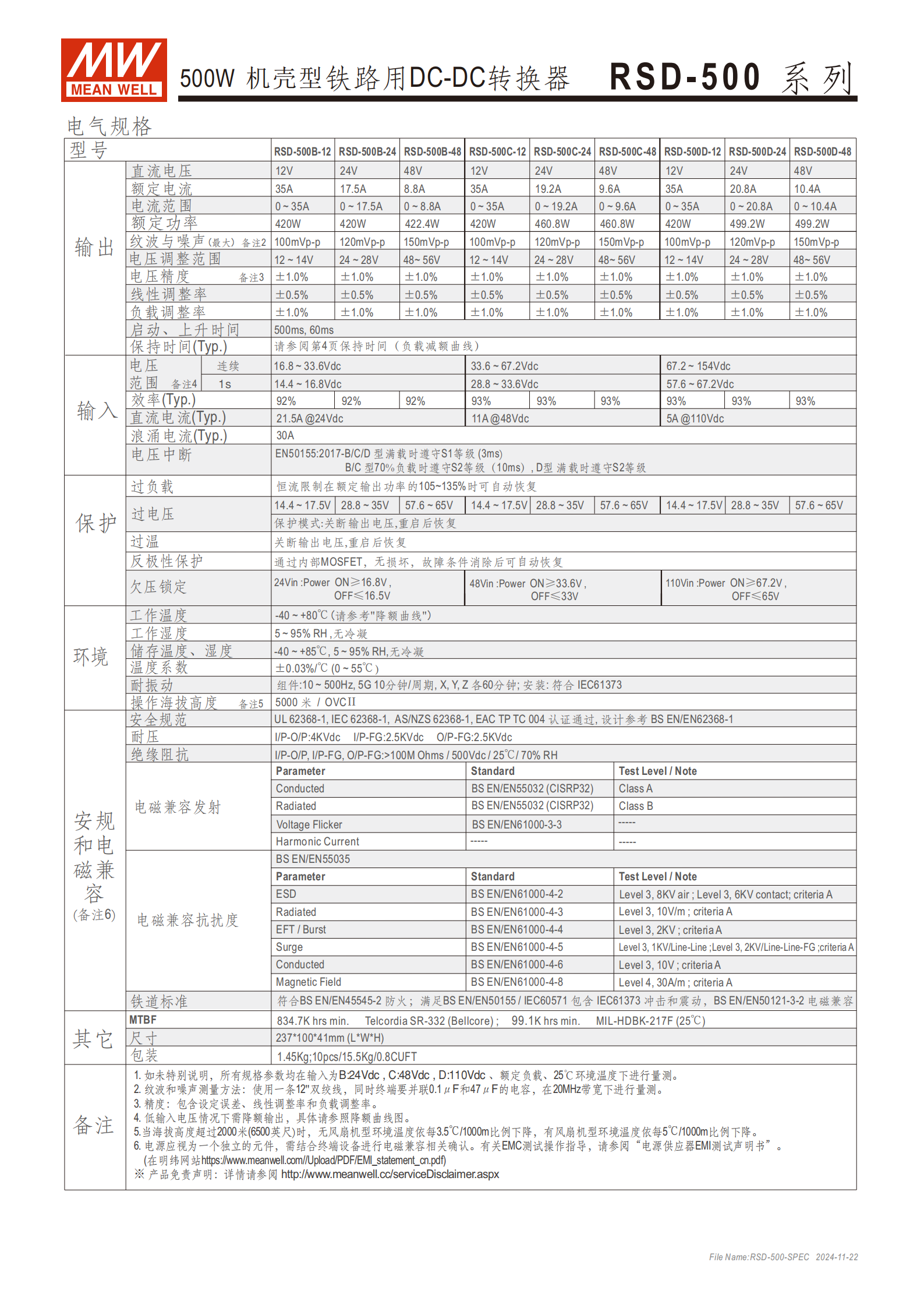 RSD-500 系列為明緯生產(chǎn)的500W 機殼型鐵路專用 DC-DC 轉(zhuǎn)換器,是面向軌道交通及惡劣工業(yè)環(huán)境的電源轉(zhuǎn)換產(chǎn)品,核心符合鐵道標(biāo)準(zhǔn)EN50155(2017 版)和EN45545-2,同時通過IEC62368-1、UL62368-1、AS/NZS62368-1等安規(guī)認證,提供3 年保固,為全球交易品項。