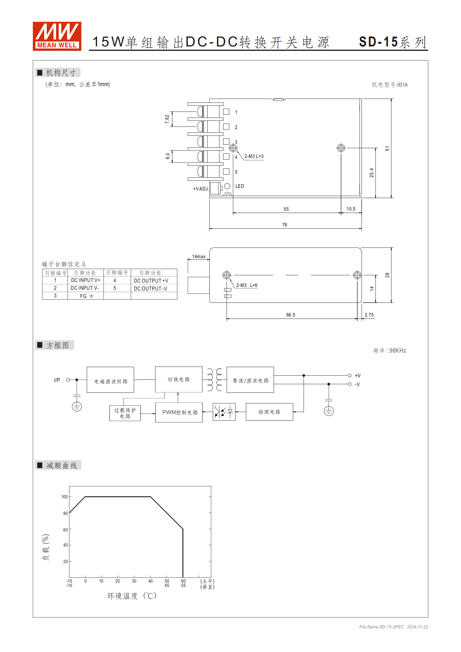 端子臺腳位定義:1 腳 DC INPUTV+、2 腳 DC INPUTV-、3 腳 FG、4 腳 DC OUTPUT+V、5 腳 DC OUTPUT-V;