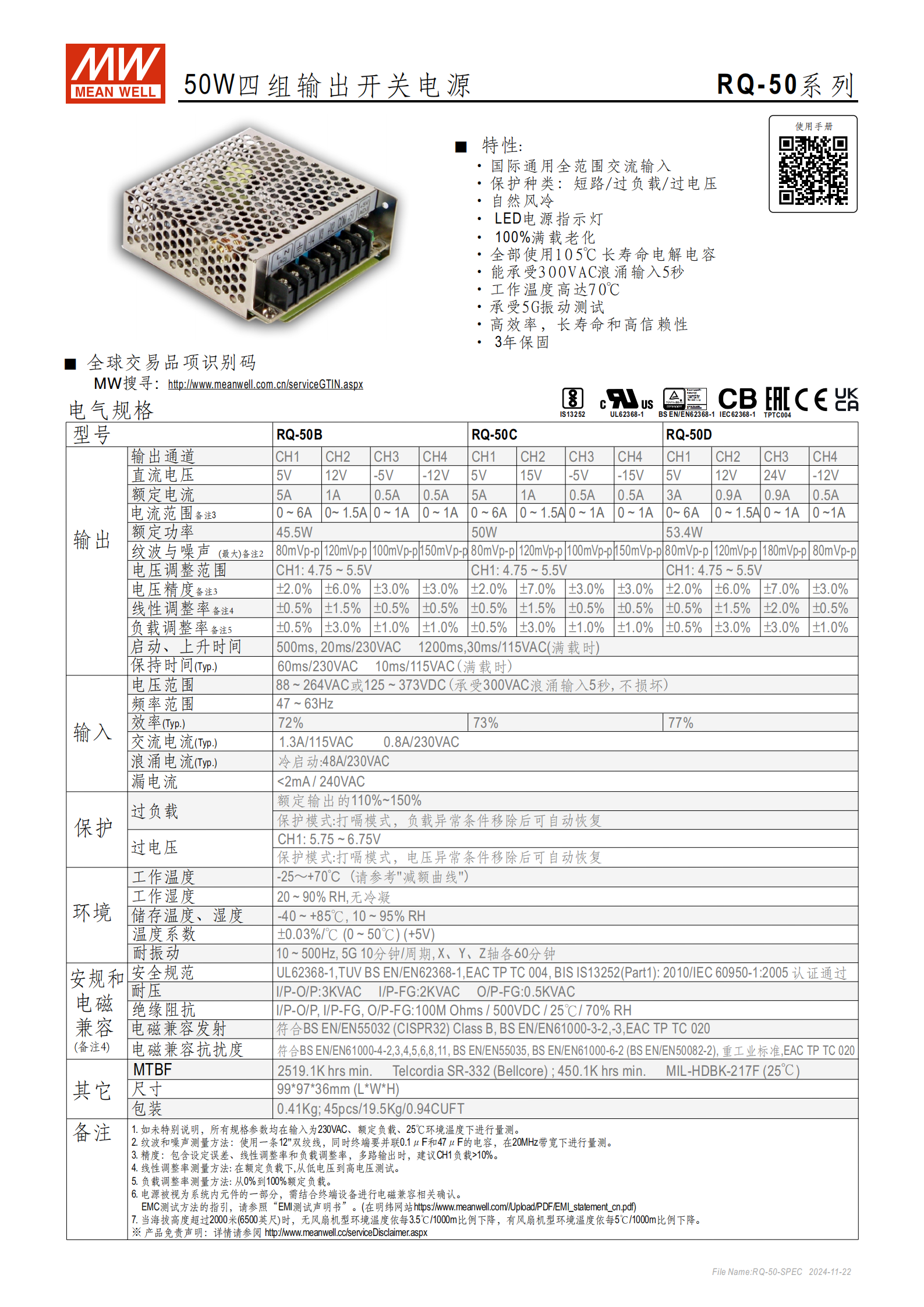RQ-50 系列是一款50W 四組輸出開關(guān)電源,具備88~264Vac 國際通用寬電壓輸入,核心優(yōu)勢包括短路 / 過負(fù)載 / 過電壓三重保護(hù)(打嗝模式)、70℃高溫工作、5G 抗振動、105℃長壽命電解電容、3 年保固,效率達(dá)72%~77% ,能承受300Vac 浪涌輸入 5 秒,尺寸為999736mm,通過 UL62368-1 等多項(xiàng)國際安全認(rèn)證,適配需多路供電的電子設(shè)備與工業(yè)模塊,可靠性突出。