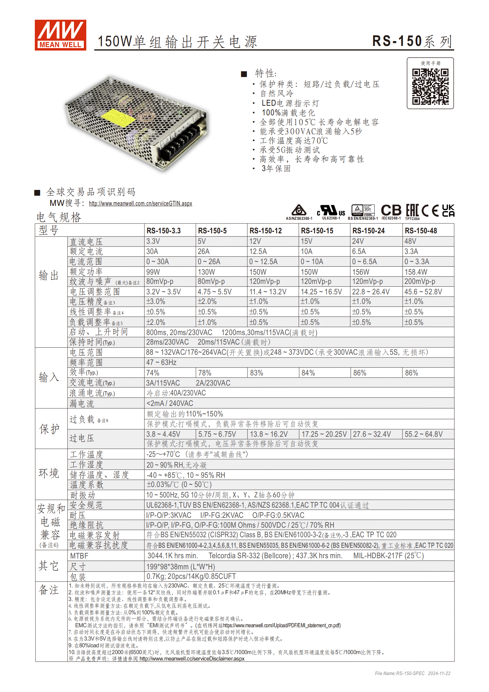 | RS-150-3.3 | 3.3V | 30A | 99W | 74% | 80mVp-p |