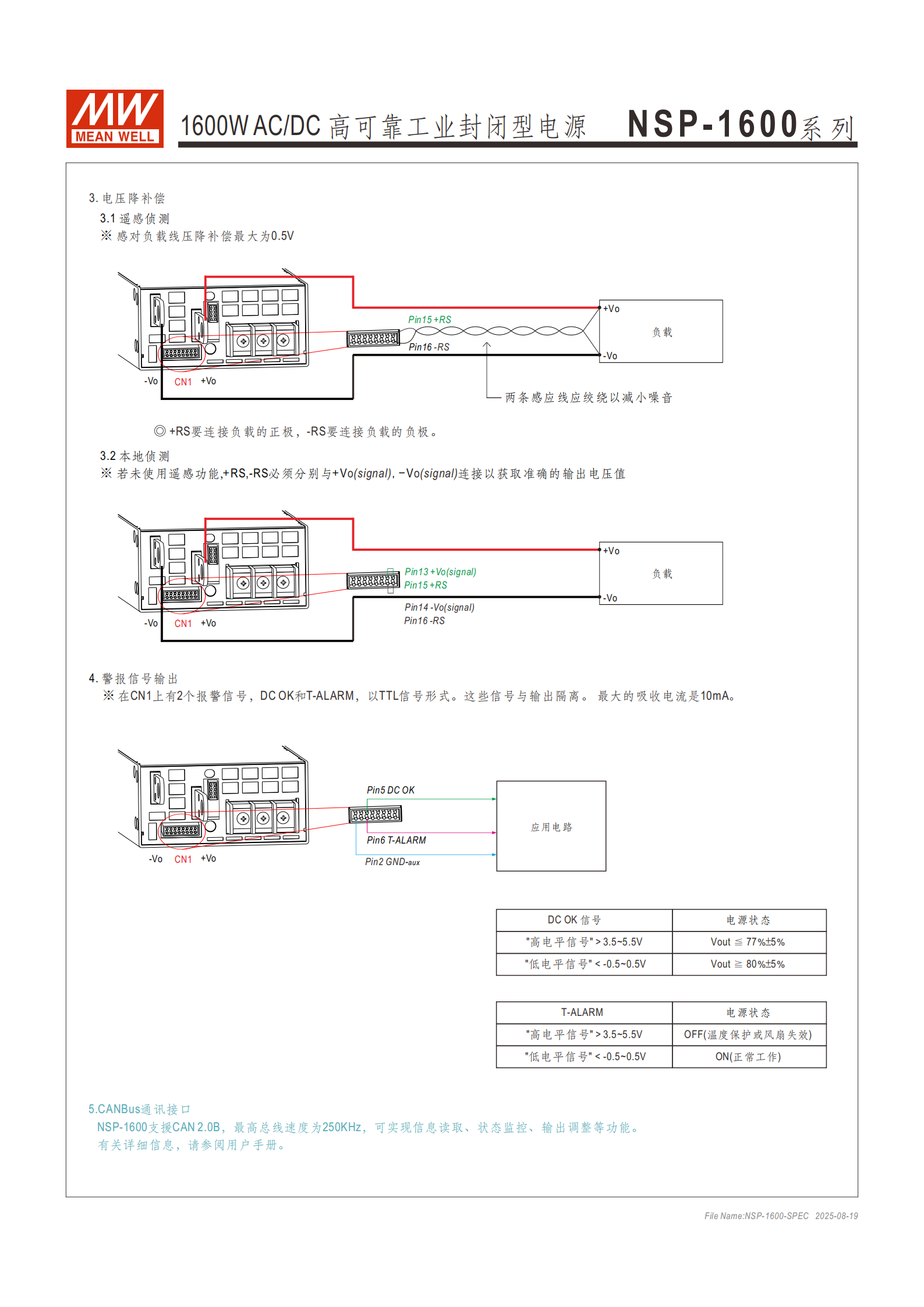 答案:保護(hù)功能包括短路、過負(fù)載(105~115% 額定功率觸發(fā),5 秒后關(guān)斷)、過電壓(不同機(jī)型對(duì)應(yīng) 15.75~75V 閾值)、過溫度(溫度下降后自動(dòng)恢復(fù))四重保護(hù);通訊與控制功能涵蓋 CANBus 通訊(支持 CAN2.0B,250KHz)、遙控開關(guān)、遠(yuǎn)程感應(yīng)(補(bǔ)償 0.5V 線壓降)、12Vaux 輔助電源及 DC OK/T-ALARM 警報(bào)信號(hào)輸出。適用場景包括工業(yè)控制 / 自動(dòng)化裝置、測(cè)試測(cè)量儀器、激光相關(guān)機(jī)器、老化設(shè)備、恒流源、數(shù)字廣播等。