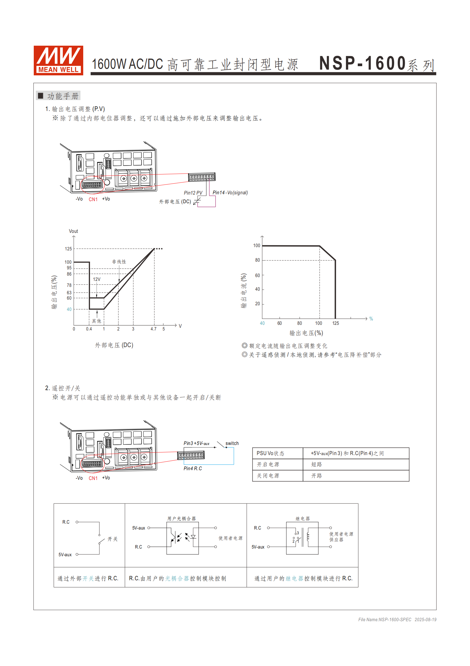 遙控開關(guān):通過電信號(hào)或干接點(diǎn)控制(Pin4 R.C 與 Pin3 +5V-aux 短路開啟,開路關(guān)閉),隔離信號(hào)(參考 GND-aux)