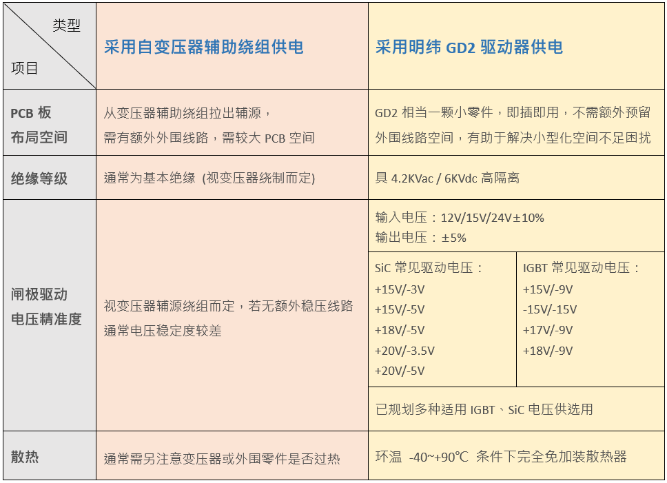 GD2 系列采模塊化設(shè)計,尺寸小、具備 4.2KVac / 6KVdc 高隔離、并有多 種驅(qū)動電壓機(jī)型供選用,相較于設(shè)計上采從系統(tǒng)內(nèi)部變壓器另拉輔源供電方式 ,使用 GD2 系列最大好處是可簡化電路板上外圍驅(qū)動線路、驅(qū)動電壓精準(zhǔn)度更 好、不須額外加裝散熱片、隔離性較佳等,兩者驅(qū)動方式最大差異詳如下表: