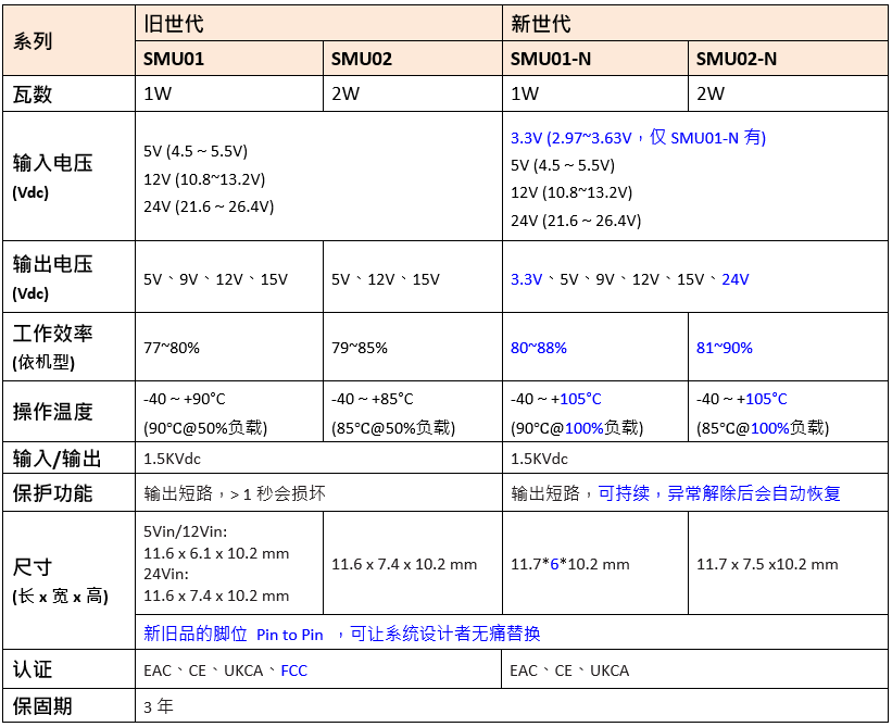 為讓用戶對于新舊品規(guī)格差異能快速了解與選型,詳如下表請參考: