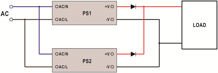 傳統(tǒng)冗余電源接法是由2個或多個電源于正端分別串接二極管的方式并聯(lián)輸出至電源總線上,如圖二所示??梢宰?個電源單獨(dú)工作,也可以讓多個電源同時(shí)工作。當(dāng)其中1個電源出現(xiàn)故障時(shí),由于二極管的單向?qū)ㄌ匦裕粫绊戨娫纯偩€的輸出。