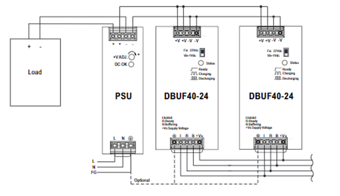 緩沖模組與不斷電系統(tǒng)有諸多差異,如表一。由于緩沖模組內(nèi)部是由電容組成,因此,有著小型化、低成本且免維護(hù)等優(yōu)點(diǎn)。此外,UPS有毫秒級(jí)的反應(yīng)時(shí)間,相較之下,緩沖模組則無此問題。緩沖模組內(nèi)部電容與電源輸出端采直接并聯(lián)的形式如圖三,當(dāng)電源輸出失效時(shí),緩沖模組內(nèi)的電容可即時(shí)供電,讓客戶有足夠時(shí)間進(jìn)行資料儲(chǔ)存。緩沖模組特別適用在資料處理相關(guān)設(shè)備,或者工業(yè)電腦供電設(shè)備。倘若終端設(shè)備負(fù)載量較大,或需較多時(shí)間儲(chǔ)存資料時(shí),緩沖模組亦能并聯(lián)使用,如圖四。
