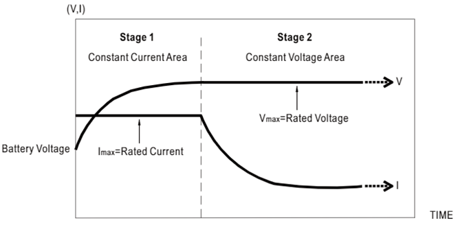 單一的鋰電池額定電壓可在3.2 V 到4.4V之間。最大充電電流可達(dá)1C。需注意不同廠商生產(chǎn)的相同化學(xué)成分鋰電池也往往有不同的額定電壓及電流??蛻粜韪鶕?jù)電池規(guī)格為準(zhǔn)。與鉛酸電池不同,鋰電池不接受高于自身額定電壓的充電壓且自放電速率極低。因此鋰電池常選用無(wú)浮充模式的二段式充電(圖二)