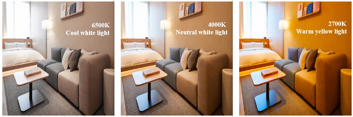 單一色溫的燈具并不能同時滿足人們的生活和工作需要,人們對光溫的需求會依不同的時間段而不一樣。如下圖二酒店房間照明,在白天,冷白光或中性白光更適合于閱讀和交流;到了晚上,溫暖的光可以緩解身心疲憊,改善睡眠質(zhì)量。因此,以色溫可調(diào)的LED燈具將會越來越廣泛應(yīng)用于住宅、酒店、辦公和其他商業(yè)照明場合,以提供個性化照明,滿足不同時段需求。