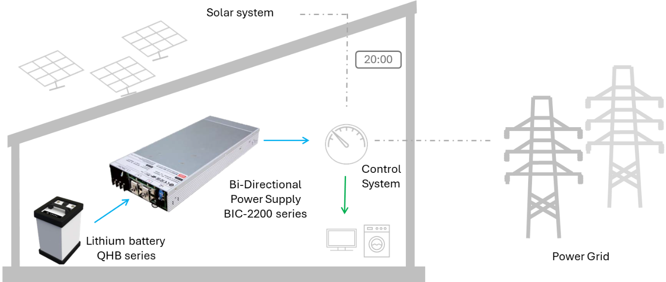 像 BIC-2200 這樣的雙向電源系統(tǒng)在家用儲能系統(tǒng)中尤其具有重要作用。例如,當太陽能板產生的多余電力未被家庭設備立即消耗時,控制系統(tǒng)可以將這些電力導入雙向電源系統(tǒng),并將交流電(AC)轉換為直流電(DC),以高效地為家用儲能電池充電。這樣的無縫整合確保了產生的能量不會浪費,將多余的能量儲存起來,供日后使用。